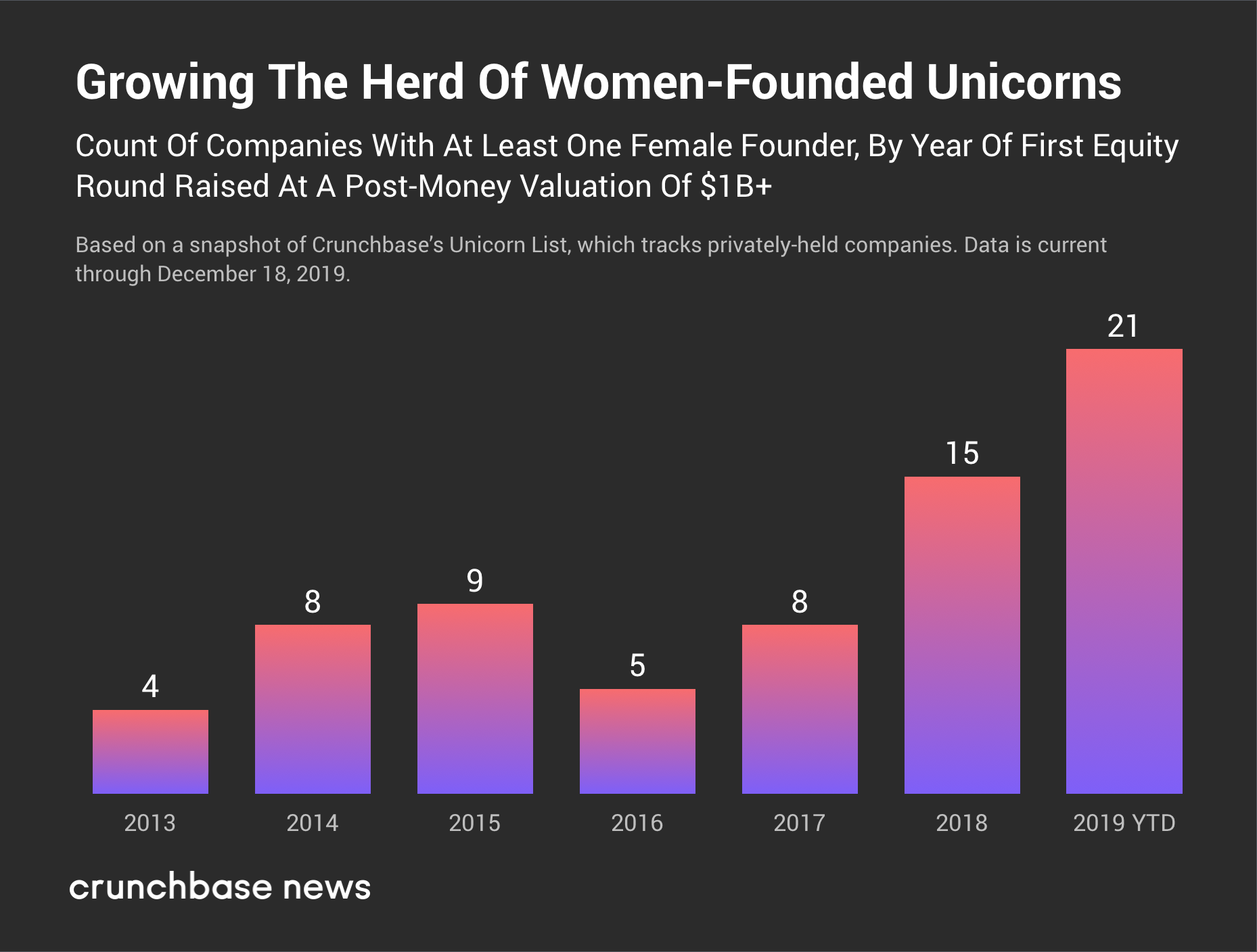数据显示,2019年新产生的独角兽中由女性创立的比以前更多。