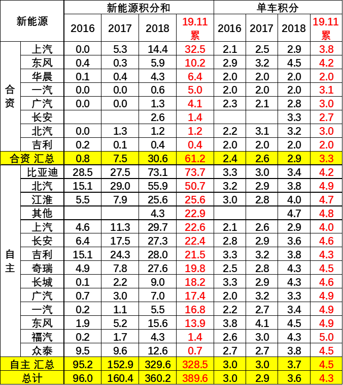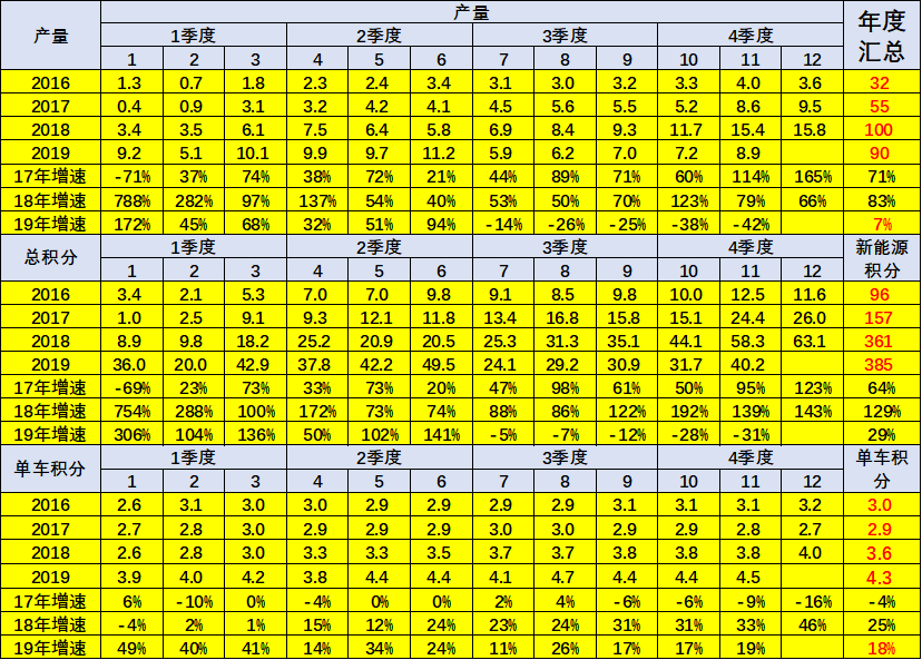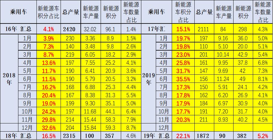 2019年11月单车积分4.5分,而2018年11月新能源车单车平均积分3.8分,2019年11月提升19%也是很好的效果。2019年1-11月较2018年1-11月单车积分提升18%。