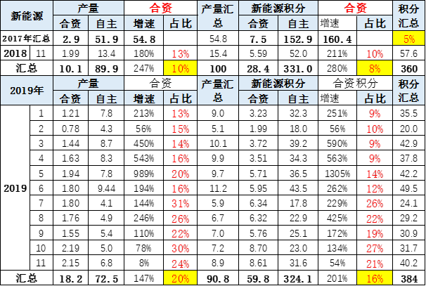 2019年1-11月合资品牌新能源车产量同比增速达到近147%。2019年合资品牌新能源产品逐步到位,新能源产量积分增长迅猛,体现合资品牌新能源的加速增长态势。