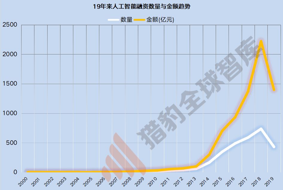 猎豹全球智库统计分析,自2000年以来,人工智能企业的融资数量已持续18年上涨,在2013年至2018年出现大爆发,融资金额和数量直线飙升,且2014年后这一数据还以接近50%的幅度在增长。