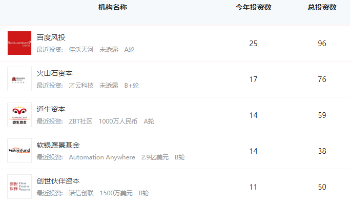 IT桔子数据显示,近5年在人工智能领域最为活跃的机构为百度风投,紧随百度之后的是火山石资本、道生资本和软银基金。