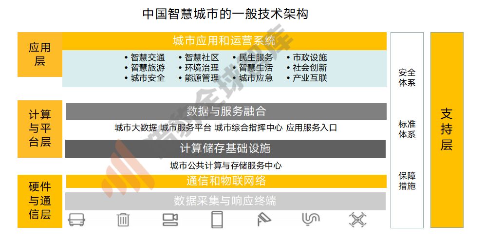 依据国家标准《GB/T 34678-2017智慧城市 技术参考模型》,由艾瑞咨询研究院整理的“中国智慧城市一般技术架构”可以大概了解智慧城市的基本要素。