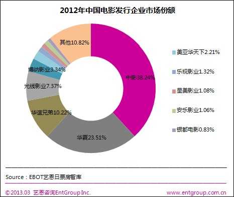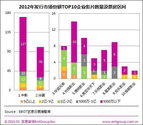 根据艺恩咨询即将发布的《2012-2013年中国电影产业研究报告》显示,2012年中国电影发行市场份额排名前十位的企业,占据了全国89.2%的市场份额,发行市场集中度较2011年的85.0%有明显提升。其中,乐视影业、安乐影业以及银都电影均是首次进入发行市场份额TOP10的企业,在新兴民营发行主体中表现不俗。