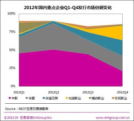 2012年四个季度中,中影、华夏、华谊兄弟、光线影业等主要企业的市场份额在第三季度均出现全年低点,而其他发行企业份额在这一时期有所增加。另外,中影、华夏两家国营企业在四个季度的市场份额分布均匀,在接近年底贺岁档的第四季度,80%的发行市场基本被中影、华夏、华谊兄弟、光线影业四大企业均分殆尽。