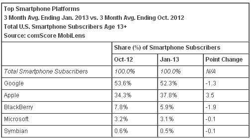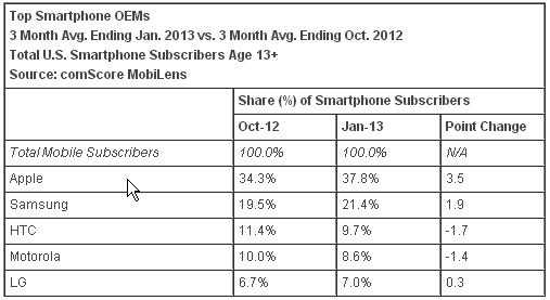 omeScor,旗下的Mobilens今天发布了截止2013年一月,平均三个月内美国智能手机市场的主要发展趋势的相关数据。苹果依然是排名第一的智能手机制造商,占据了37.8%的OEM市场份额,Google开发的Android则是智能手机平台的第一,占52.3%的市场份额。