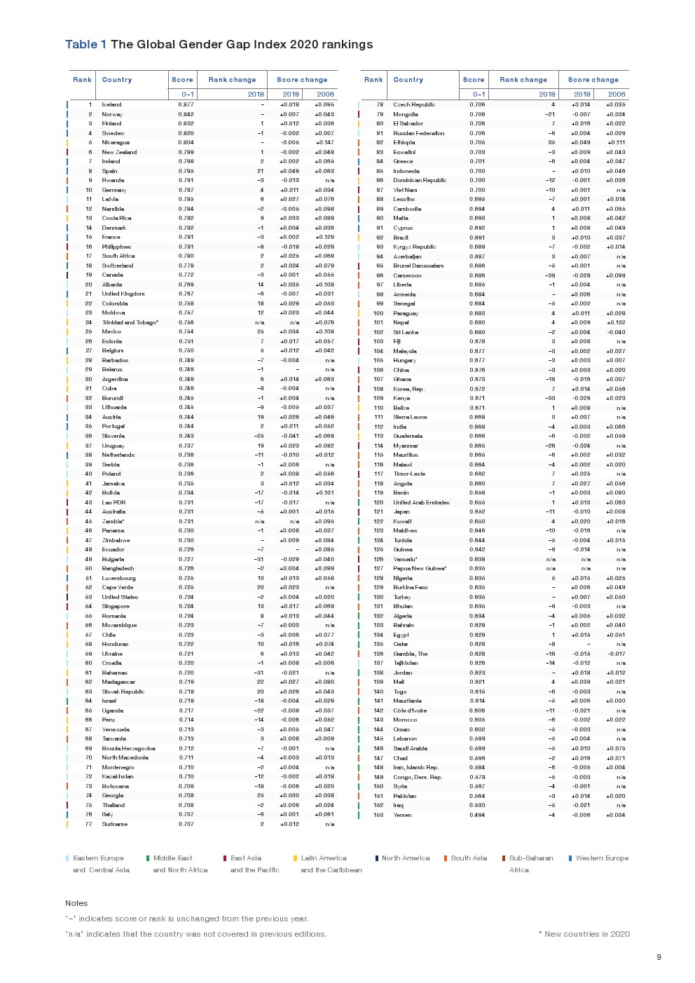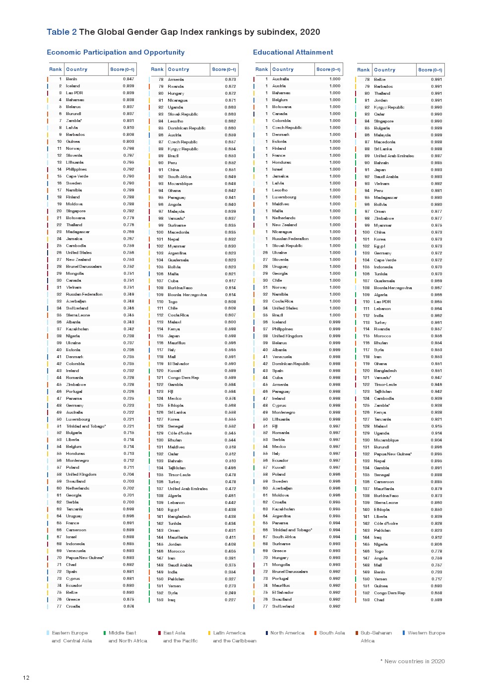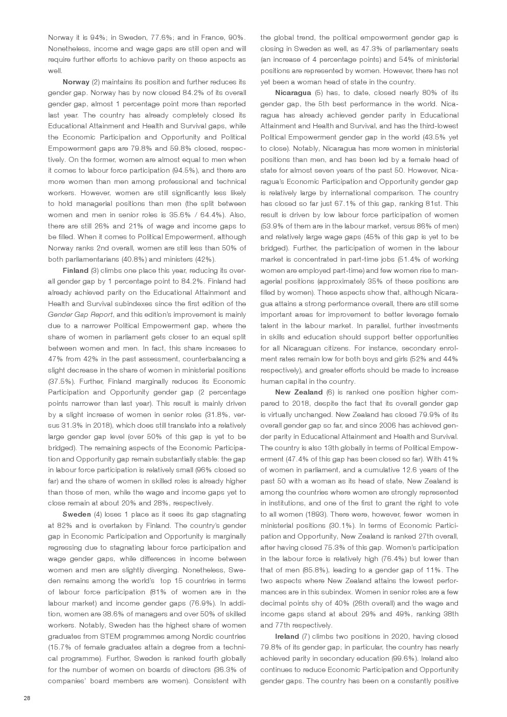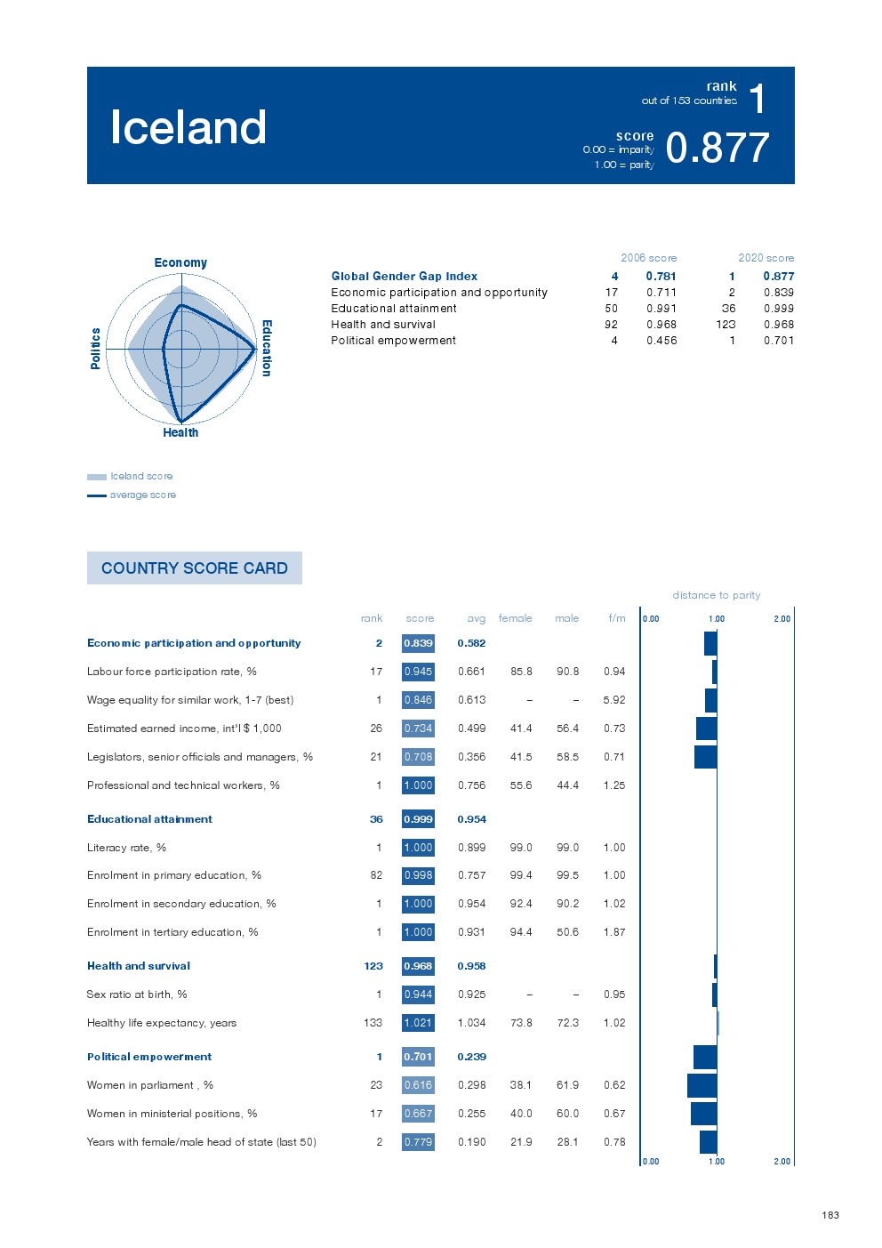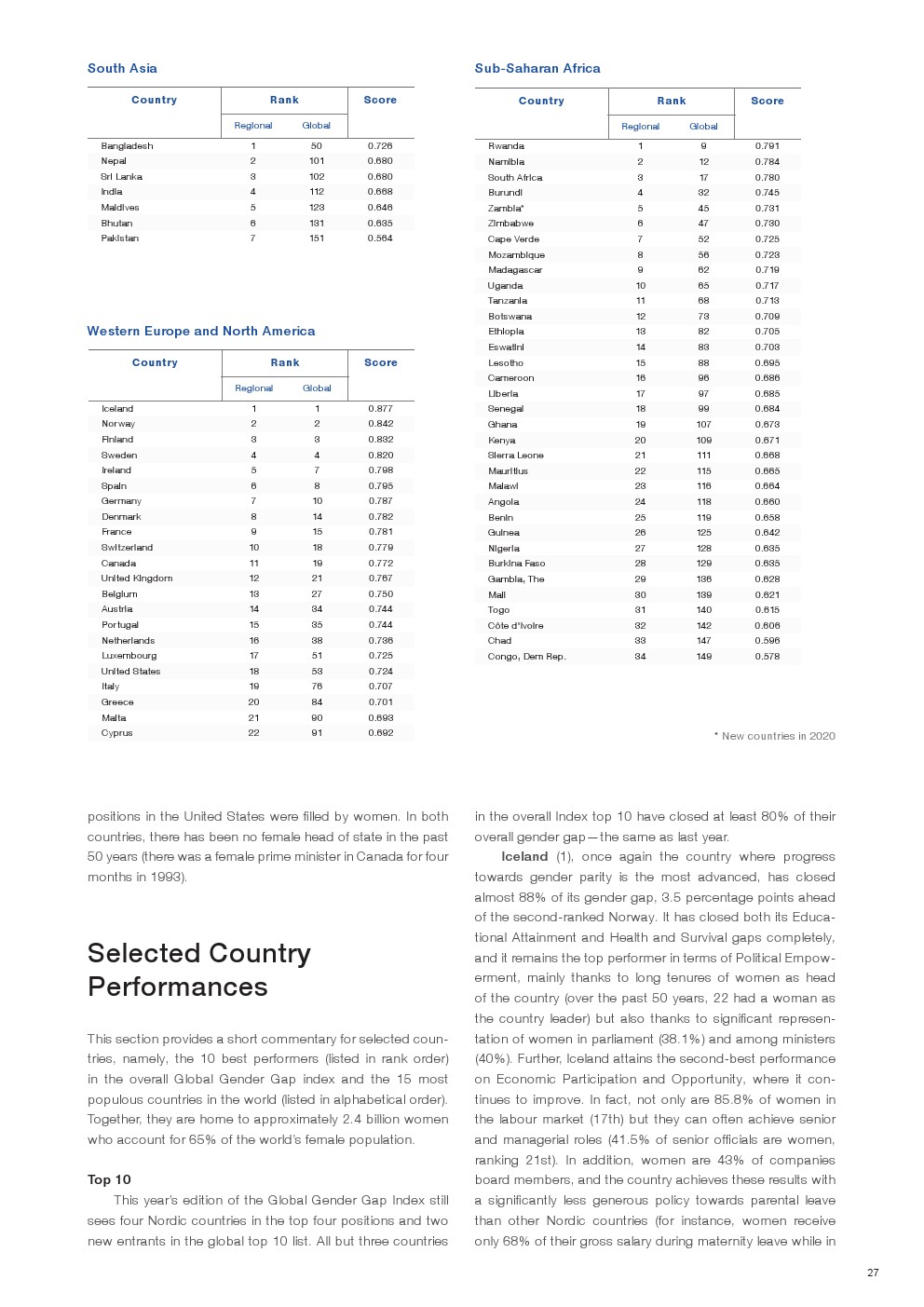 冰岛连续第11次成为世界上性别最平等的国家。它已经缩小了近88%的总体性别差距。紧随其后的是挪威(84.2%)、芬兰(83.2%)和瑞典(82.0%)、尼加拉瓜(第5位,80.4%)、新西兰(第6位,79.9%)、爱尔兰(第7位,79.8%)、西班牙(第8位,79.5%)、卢旺达(第9位,79.1%)和德国(第10位,78.7%)。