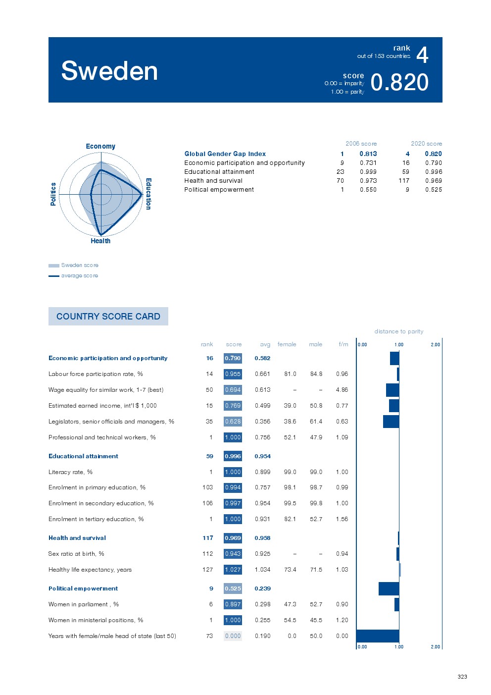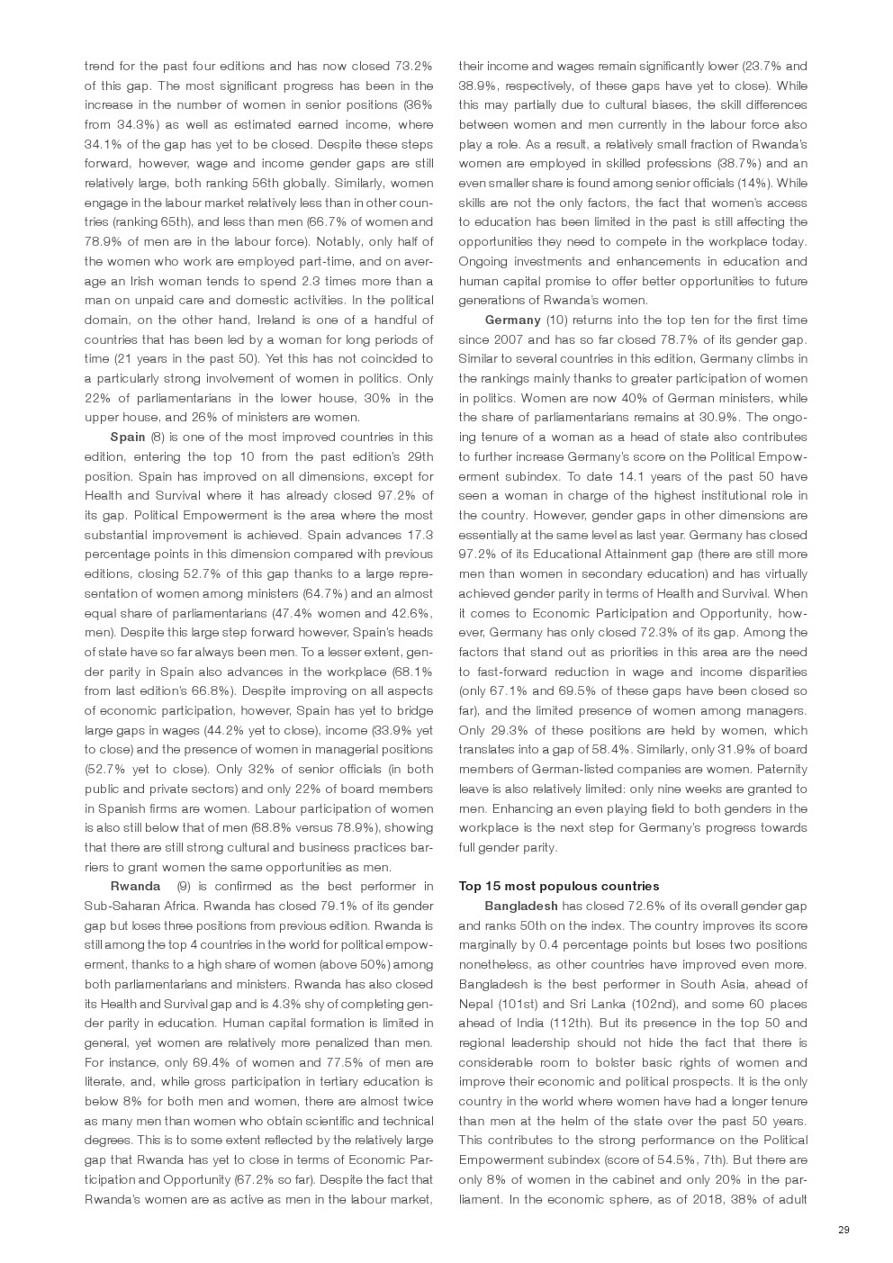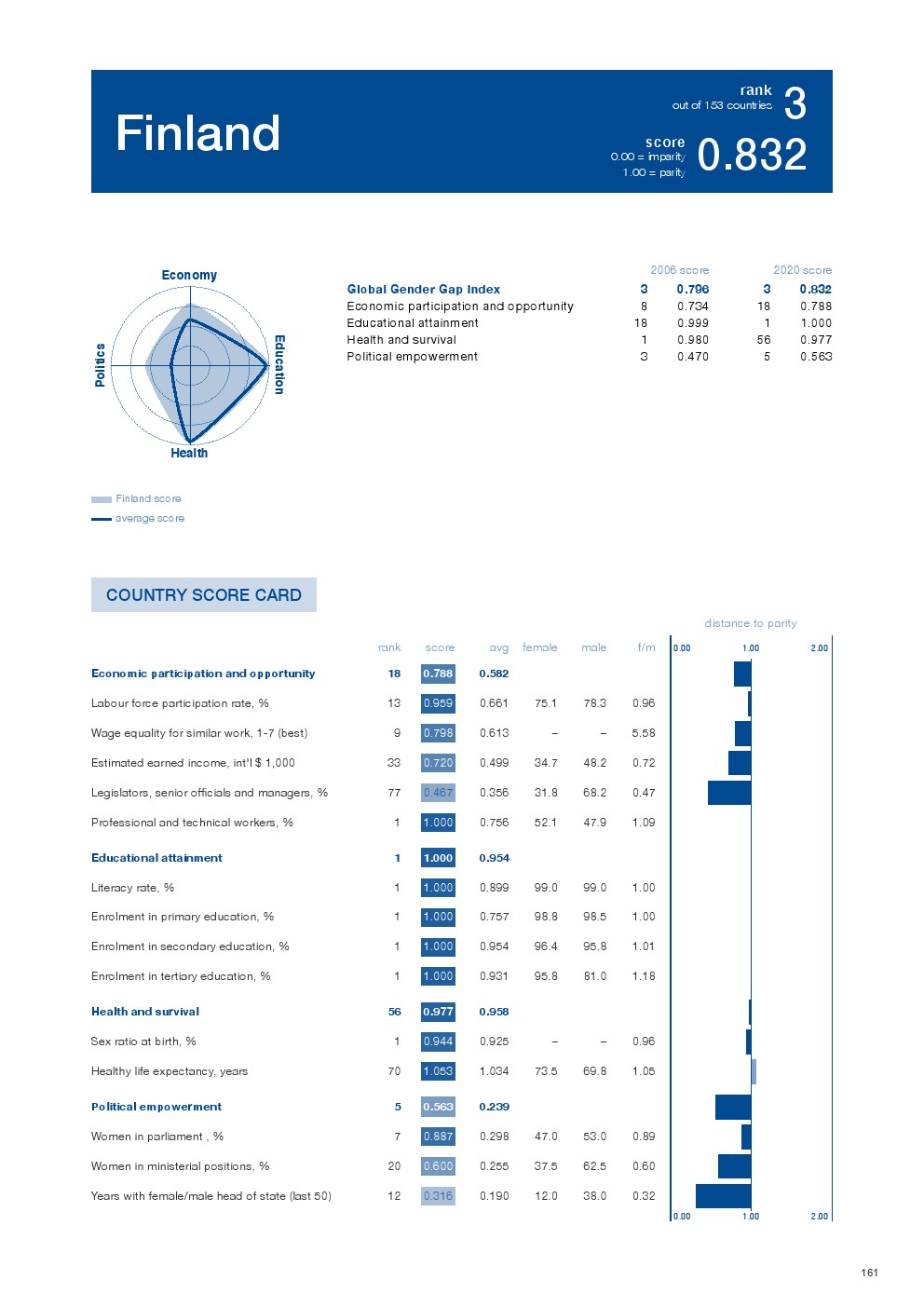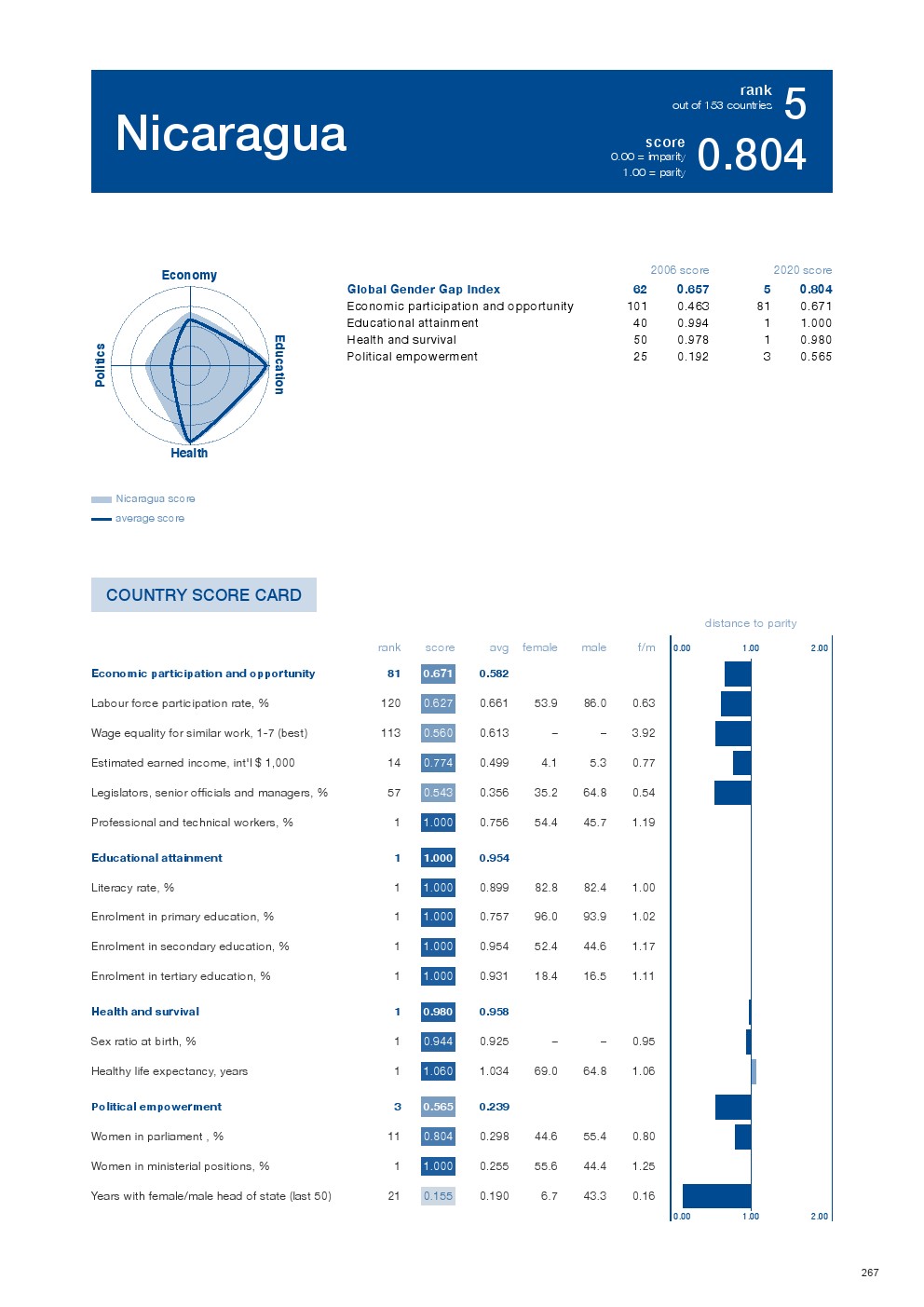 冰岛连续第11次成为世界上性别最平等的国家。它已经缩小了近88%的总体性别差距。紧随其后的是挪威(84.2%)、芬兰(83.2%)和瑞典(82.0%)、尼加拉瓜(第5位,80.4%)、新西兰(第6位,79.9%)、爱尔兰(第7位,79.8%)、西班牙(第8位,79.5%)、卢旺达(第9位,79.1%)和德国(第10位,78.7%)。