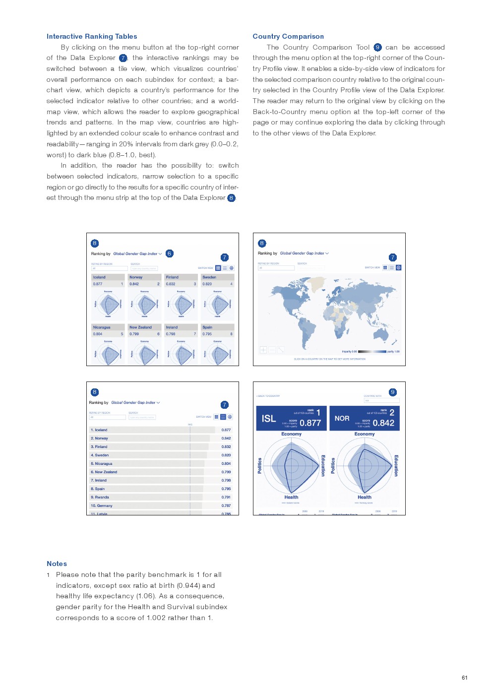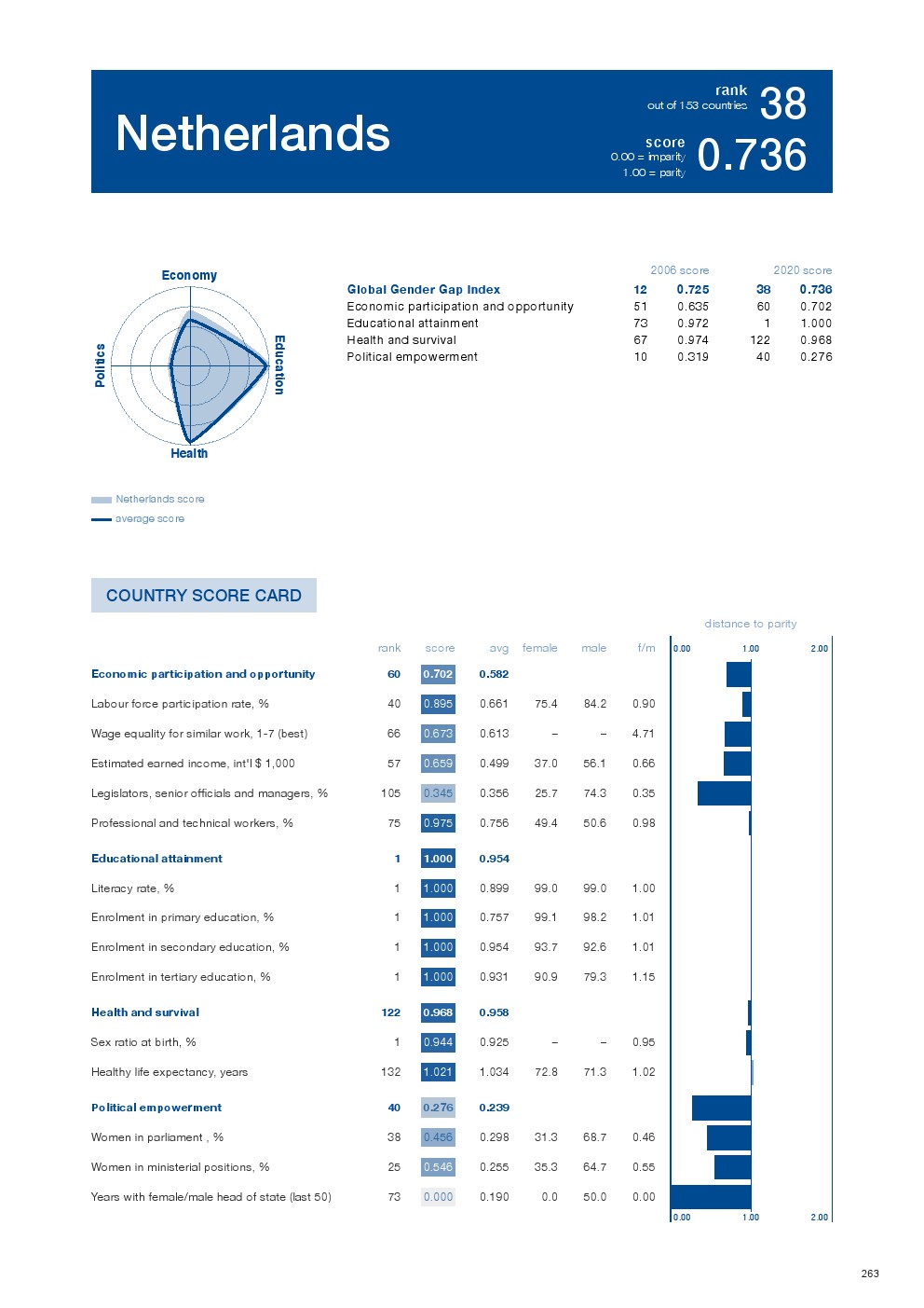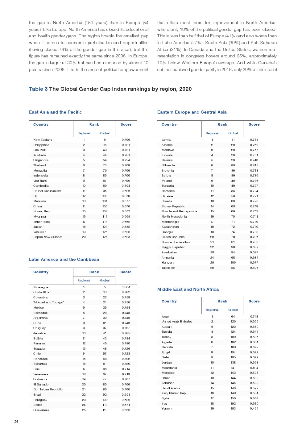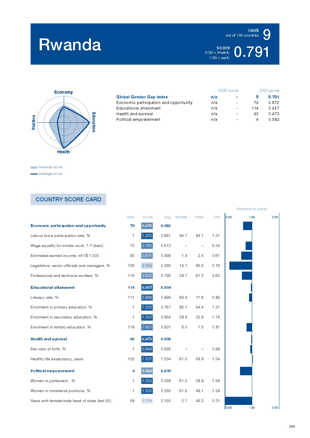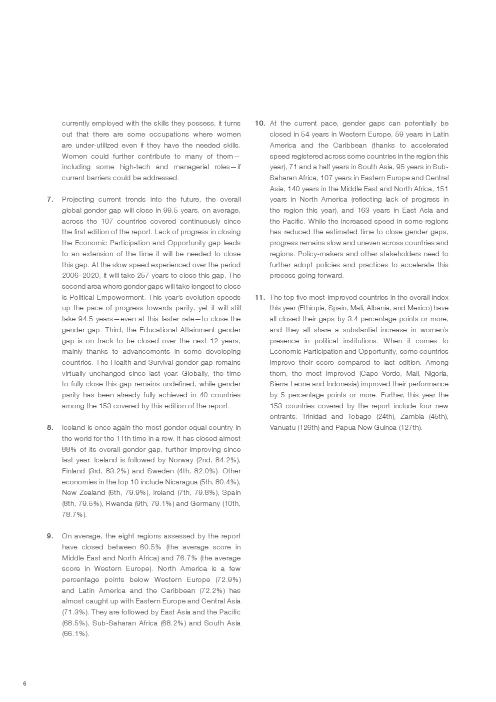 冰岛连续第11次成为世界上性别最平等的国家。它已经缩小了近88%的总体性别差距。紧随其后的是挪威(84.2%)、芬兰(83.2%)和瑞典(82.0%)、尼加拉瓜(第5位,80.4%)、新西兰(第6位,79.9%)、爱尔兰(第7位,79.8%)、西班牙(第8位,79.5%)、卢旺达(第9位,79.1%)和德国(第10位,78.7%)。