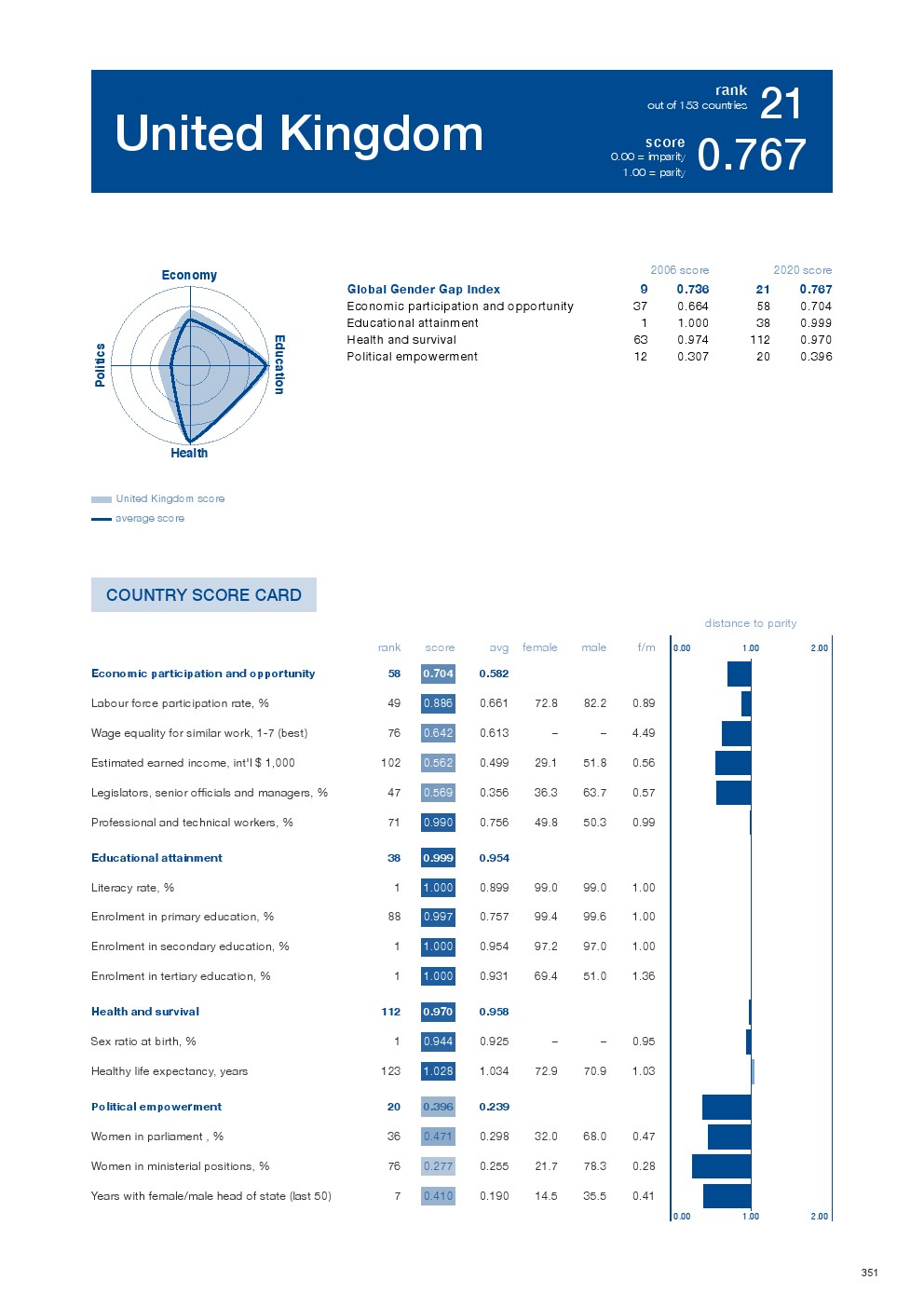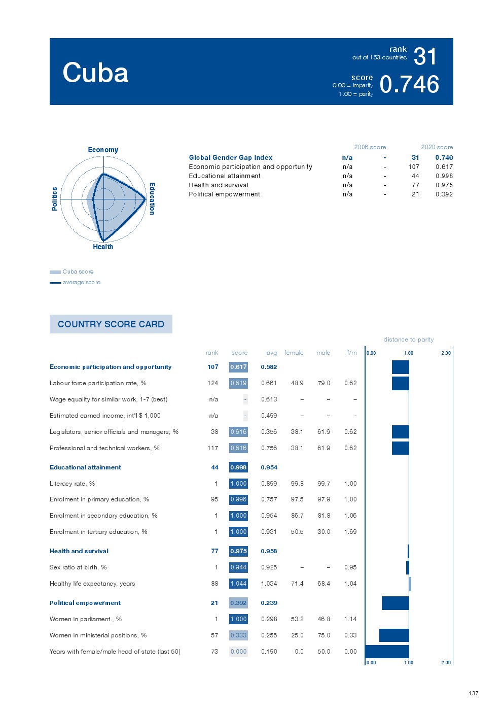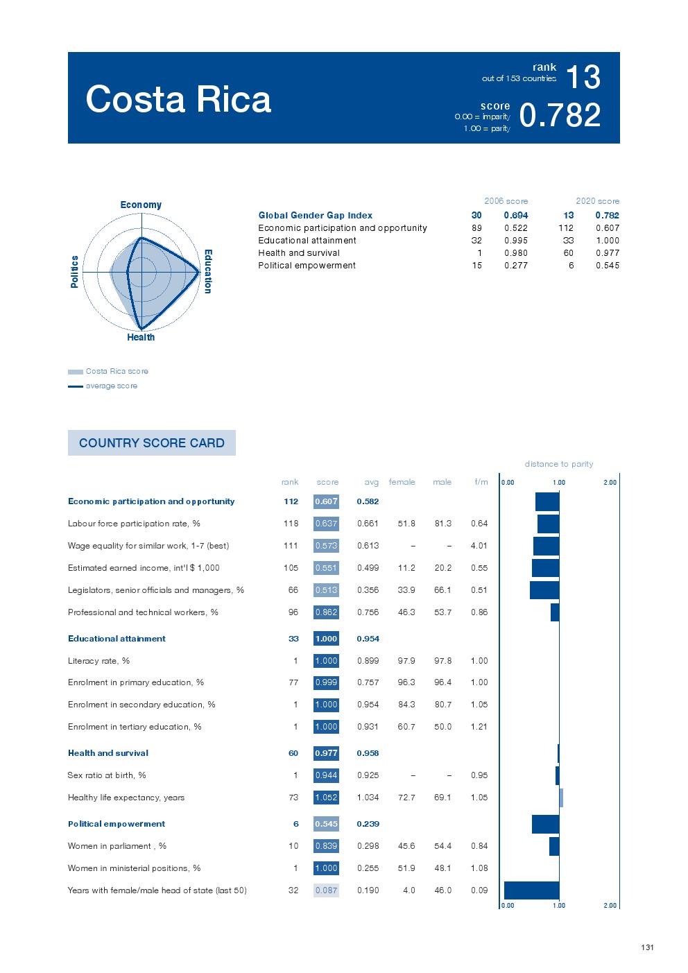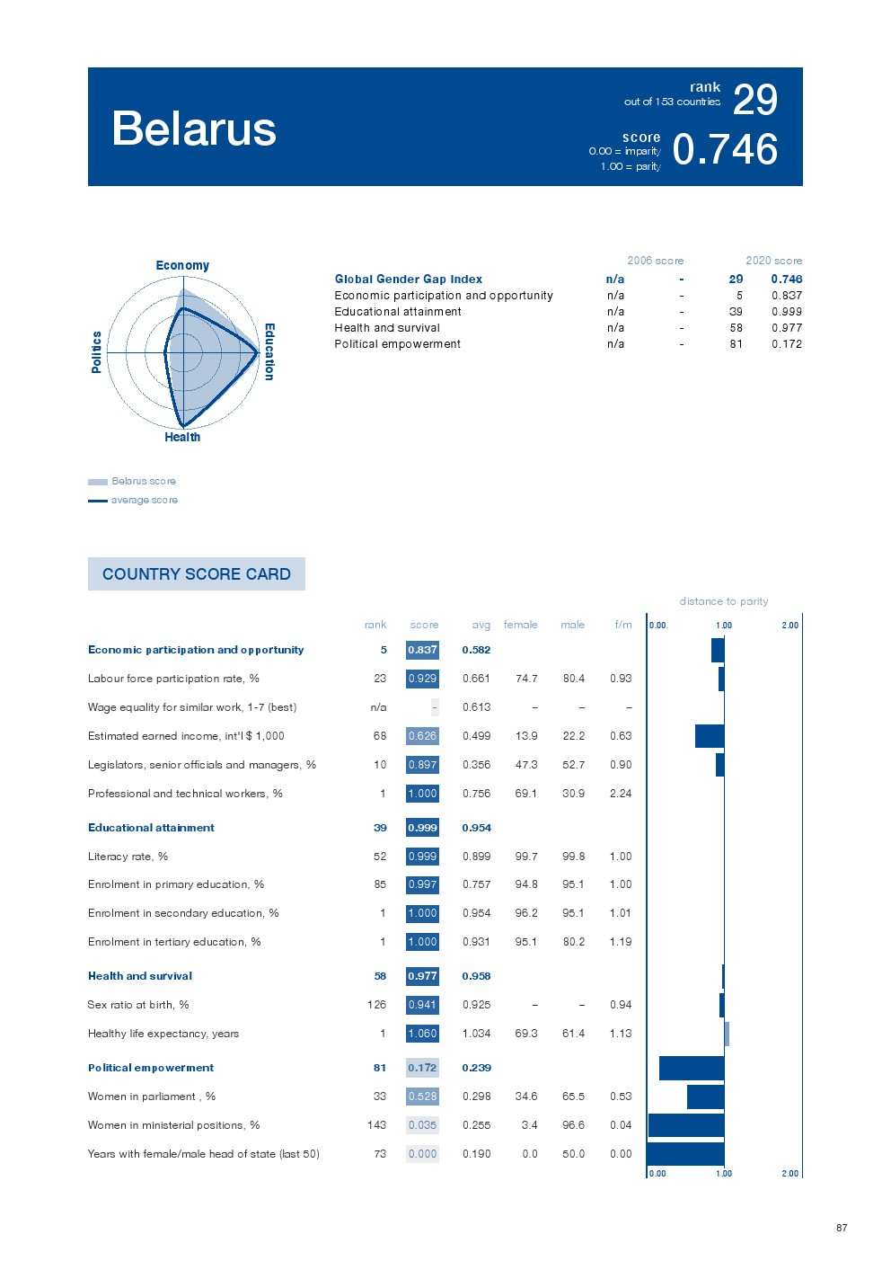 冰岛连续第11次成为世界上性别最平等的国家。它已经缩小了近88%的总体性别差距。紧随其后的是挪威(84.2%)、芬兰(83.2%)和瑞典(82.0%)、尼加拉瓜(第5位,80.4%)、新西兰(第6位,79.9%)、爱尔兰(第7位,79.8%)、西班牙(第8位,79.5%)、卢旺达(第9位,79.1%)和德国(第10位,78.7%)。