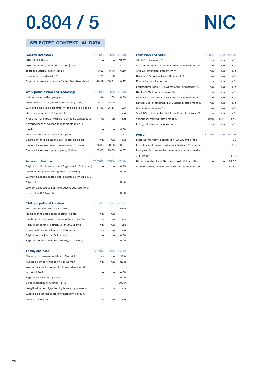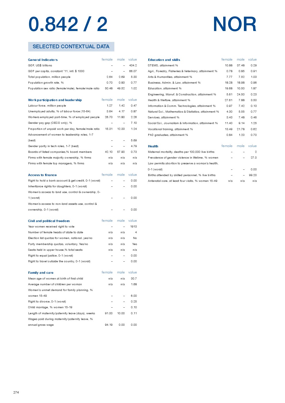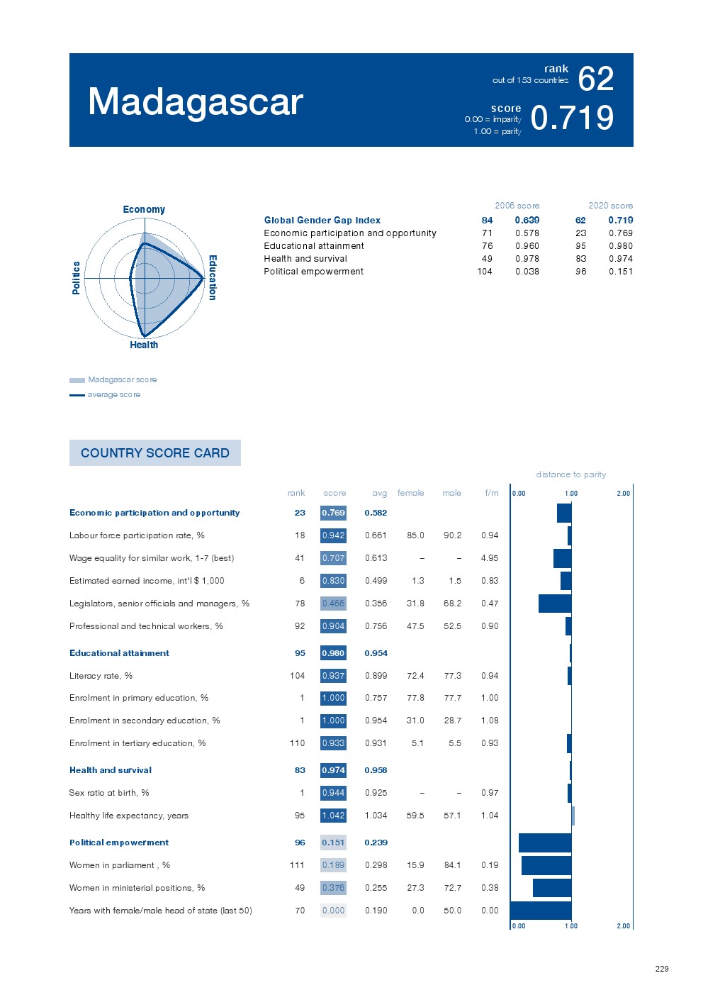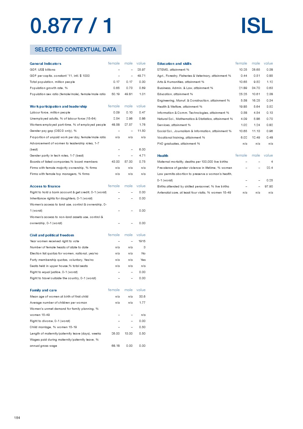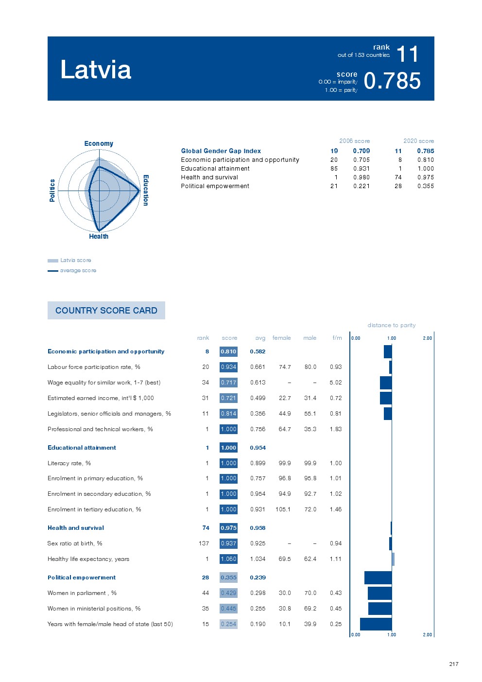 冰岛连续第11次成为世界上性别最平等的国家。它已经缩小了近88%的总体性别差距。紧随其后的是挪威(84.2%)、芬兰(83.2%)和瑞典(82.0%)、尼加拉瓜(第5位,80.4%)、新西兰(第6位,79.9%)、爱尔兰(第7位,79.8%)、西班牙(第8位,79.5%)、卢旺达(第9位,79.1%)和德国(第10位,78.7%)。