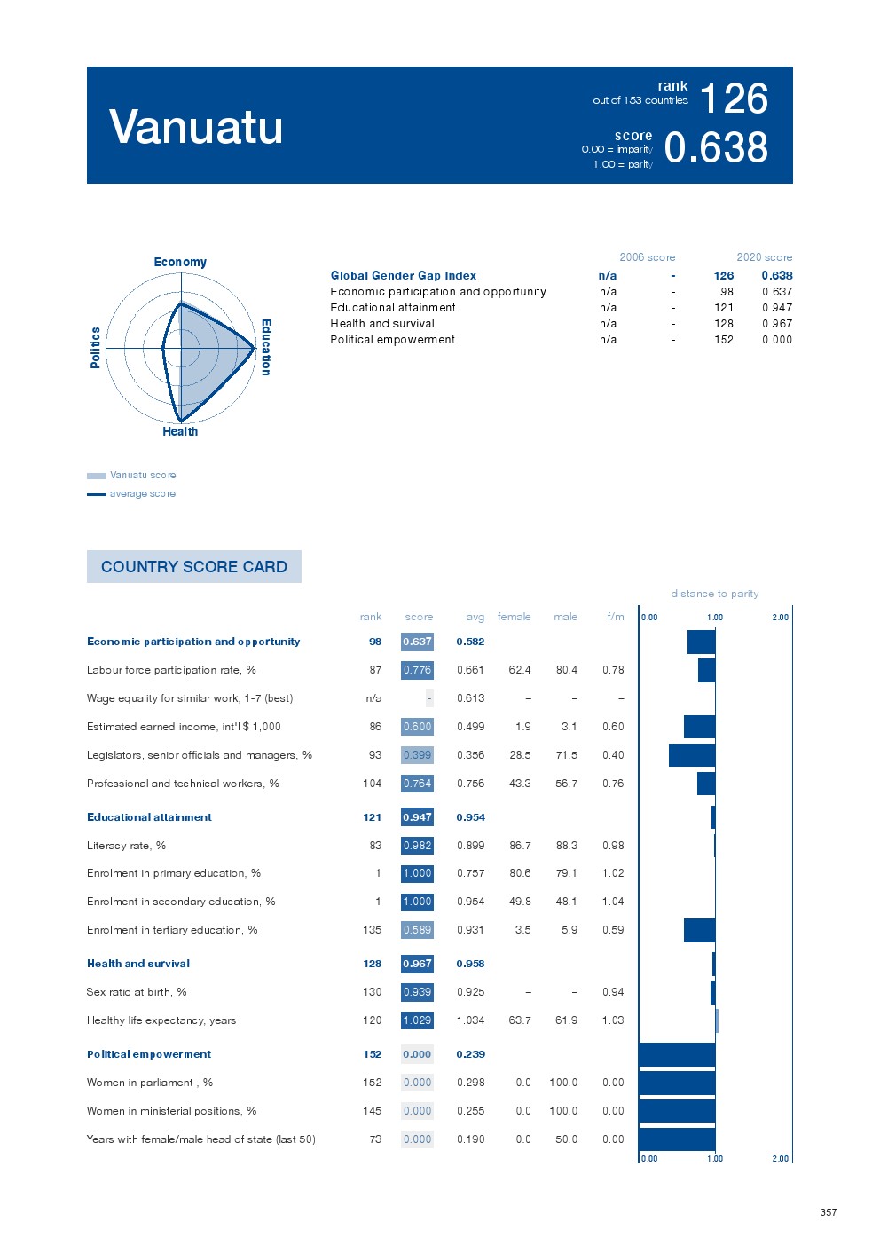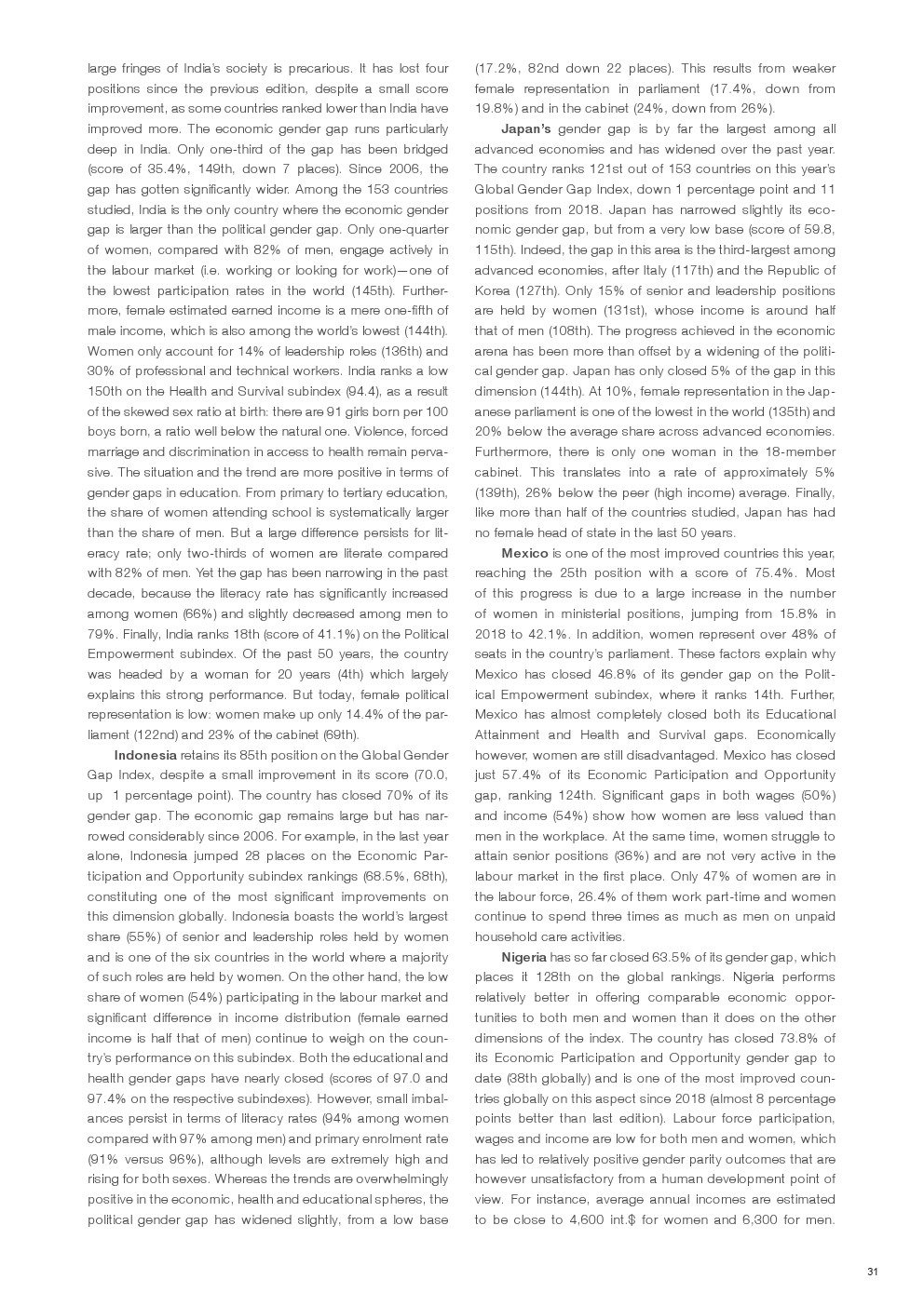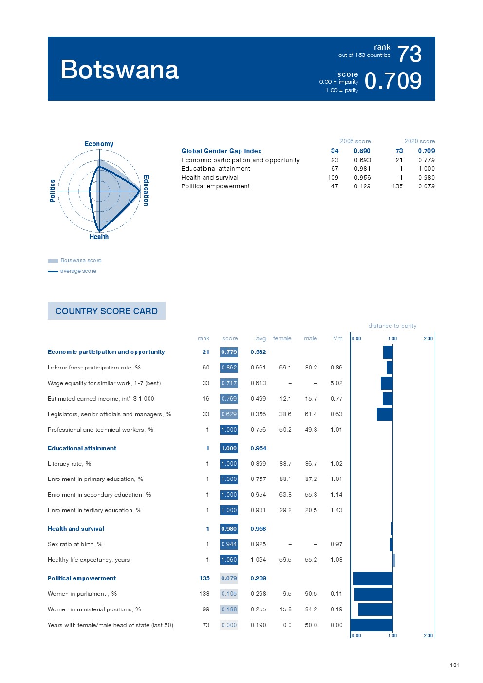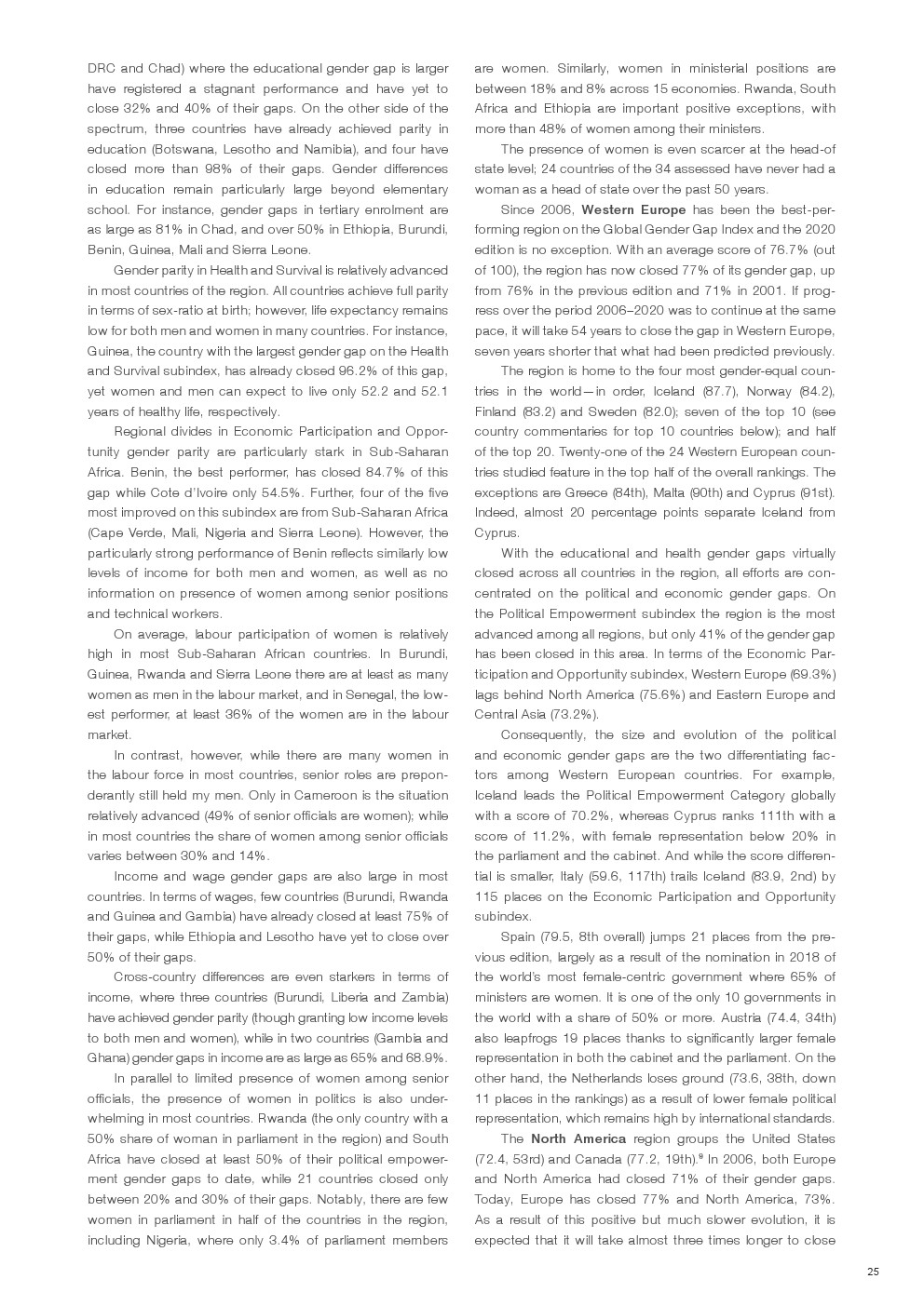 冰岛连续第11次成为世界上性别最平等的国家。它已经缩小了近88%的总体性别差距。紧随其后的是挪威(84.2%)、芬兰(83.2%)和瑞典(82.0%)、尼加拉瓜(第5位,80.4%)、新西兰(第6位,79.9%)、爱尔兰(第7位,79.8%)、西班牙(第8位,79.5%)、卢旺达(第9位,79.1%)和德国(第10位,78.7%)。