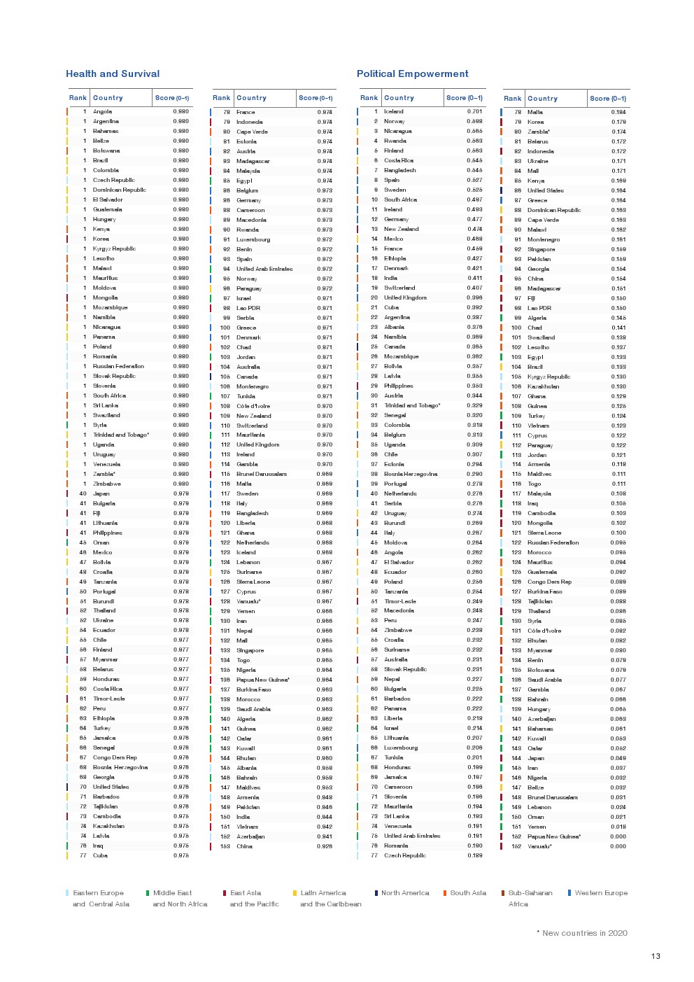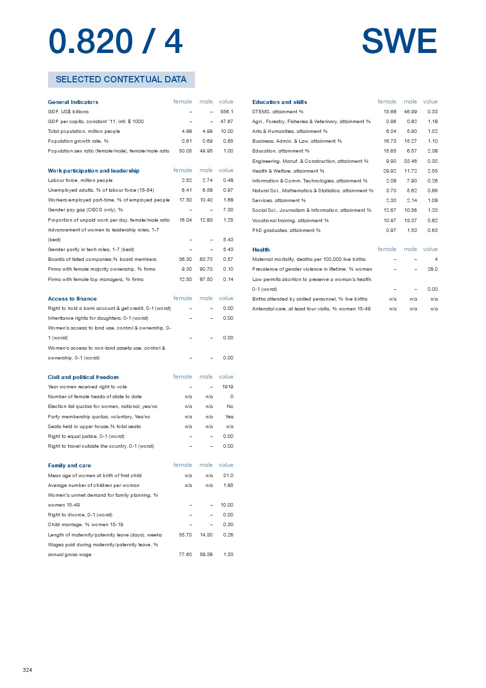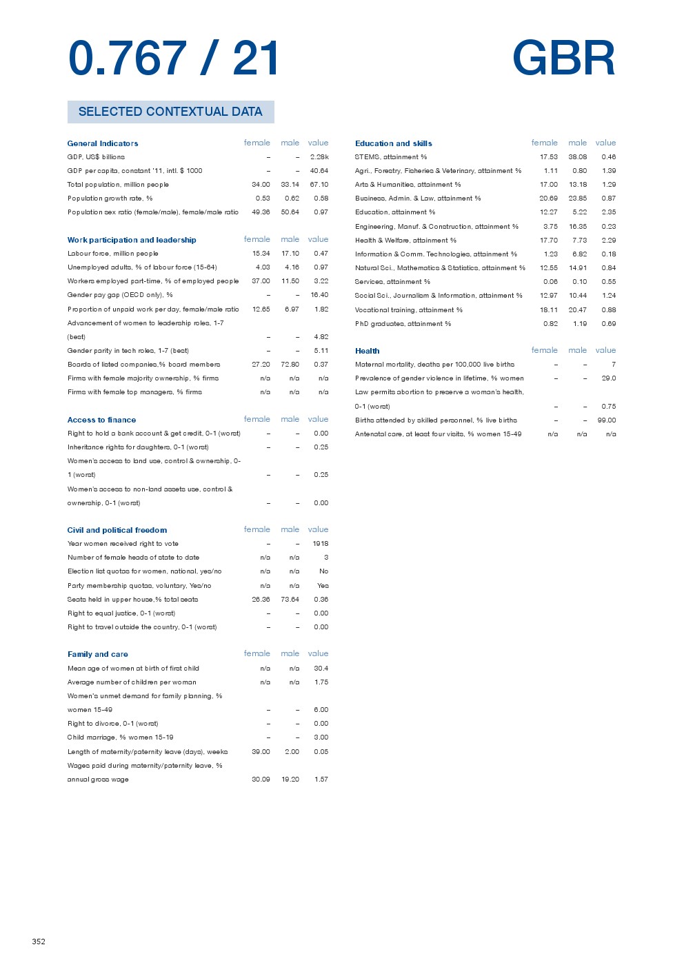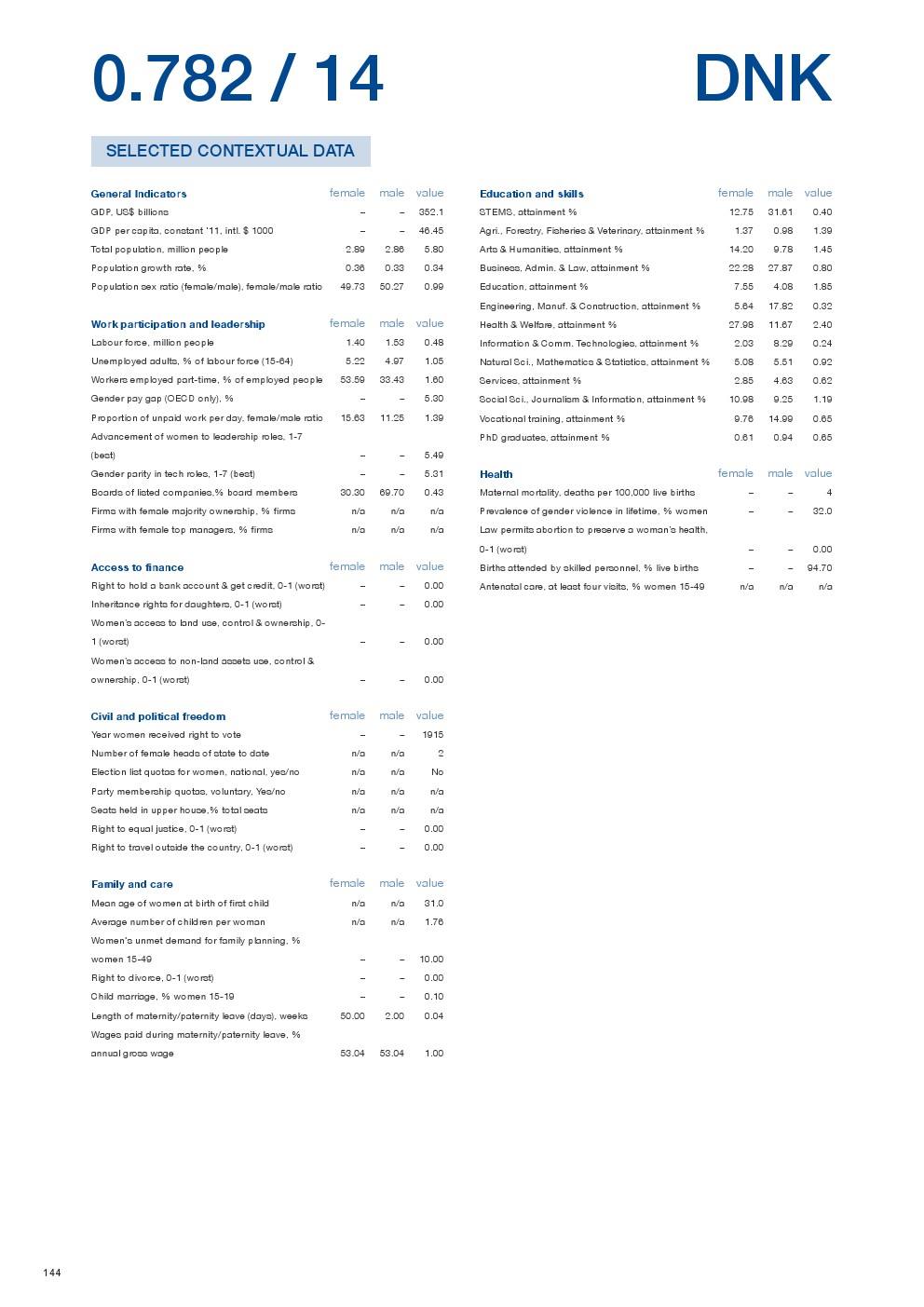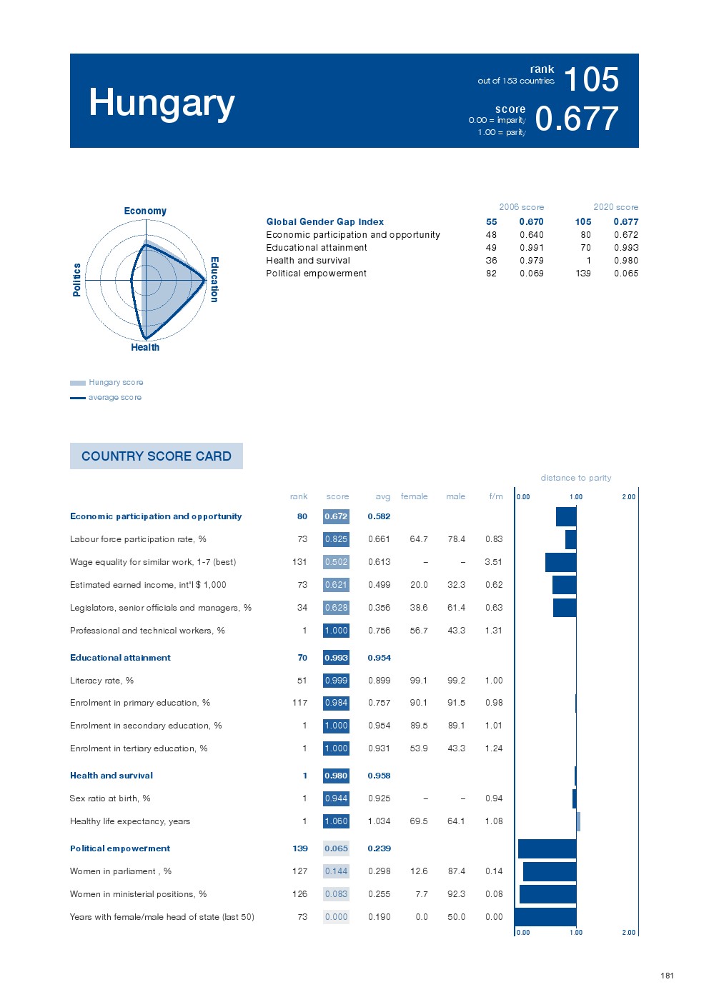 冰岛连续第11次成为世界上性别最平等的国家。它已经缩小了近88%的总体性别差距。紧随其后的是挪威(84.2%)、芬兰(83.2%)和瑞典(82.0%)、尼加拉瓜(第5位,80.4%)、新西兰(第6位,79.9%)、爱尔兰(第7位,79.8%)、西班牙(第8位,79.5%)、卢旺达(第9位,79.1%)和德国(第10位,78.7%)。