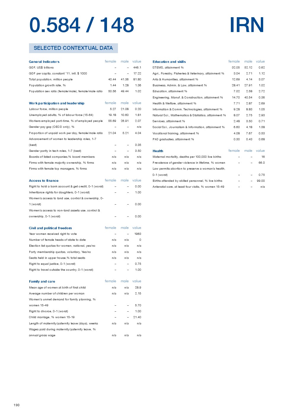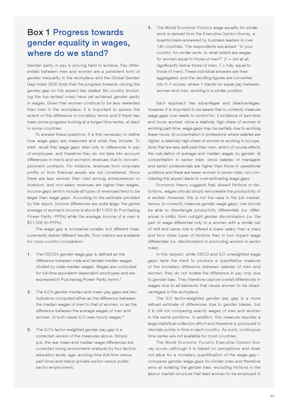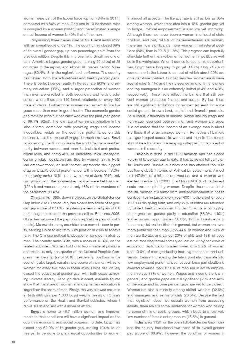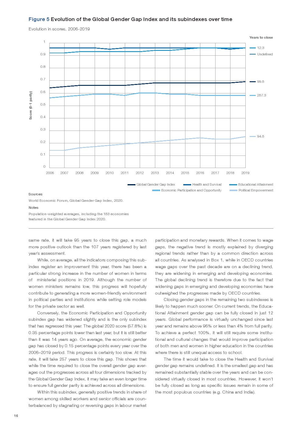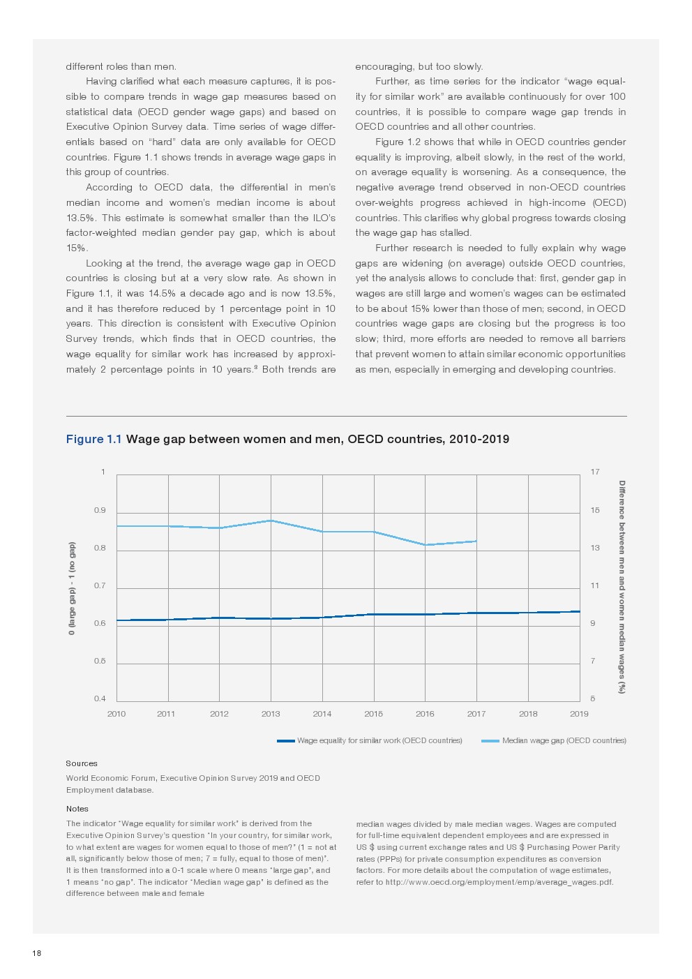 女性参与劳动市场保持稳定,但收入差距有所扩大。55%的成年女性进入劳动力市场;相比之下,78%的成年男性进入劳动力市场。超过40%的工资差距和超过50%的收入差距仍有待弥合。