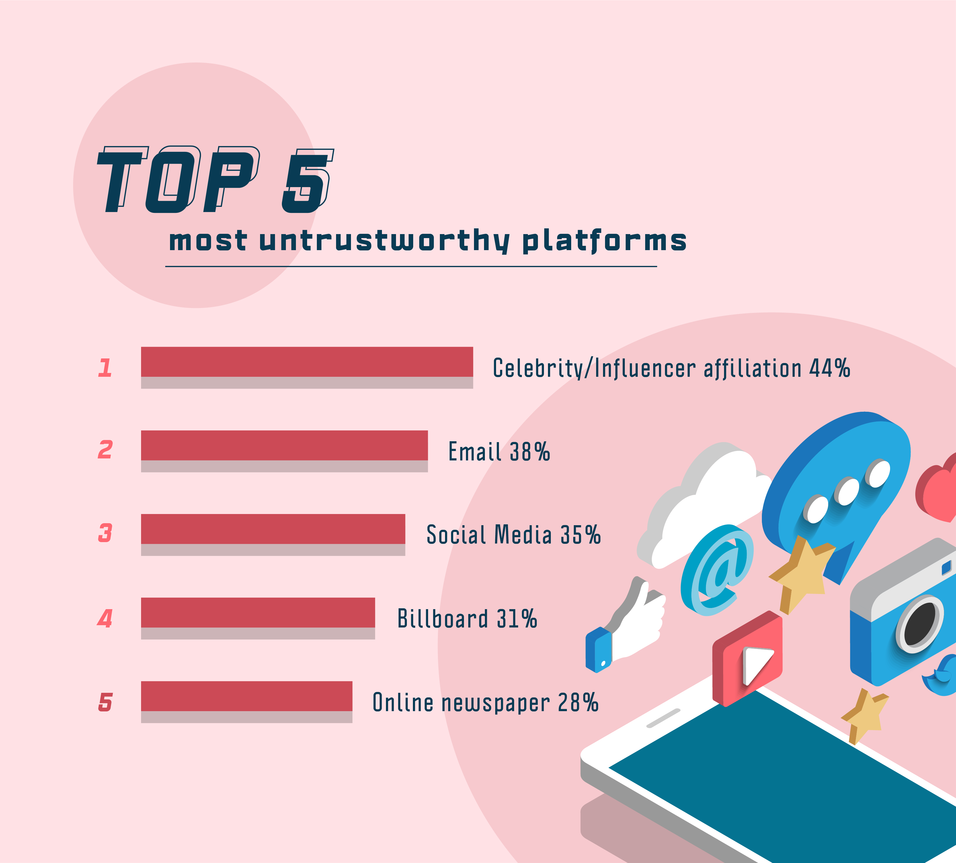 超过1/3的受访者认为通过电子邮件(38%)和社交媒体(35%)投放的广告不值得信任。几乎1/3的受访者(28%)对在线报纸持同样的看法。在所有这些平台中,最不值得信任的平台是名人或意见领袖(44%)。