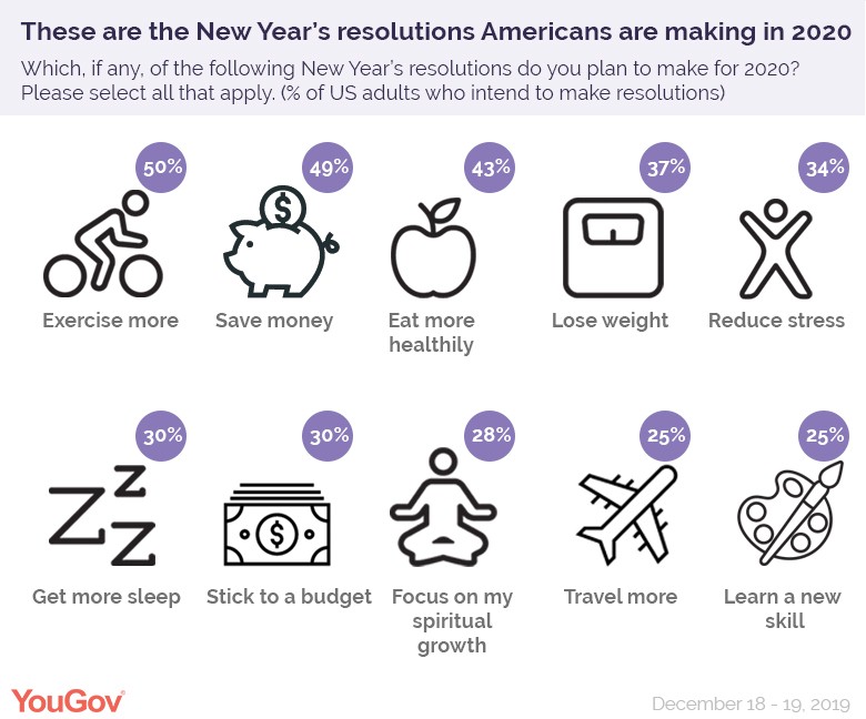 2019年12月进行的一项调查显示,近三成的美国人(28%)计划制定2020年的新年计划。