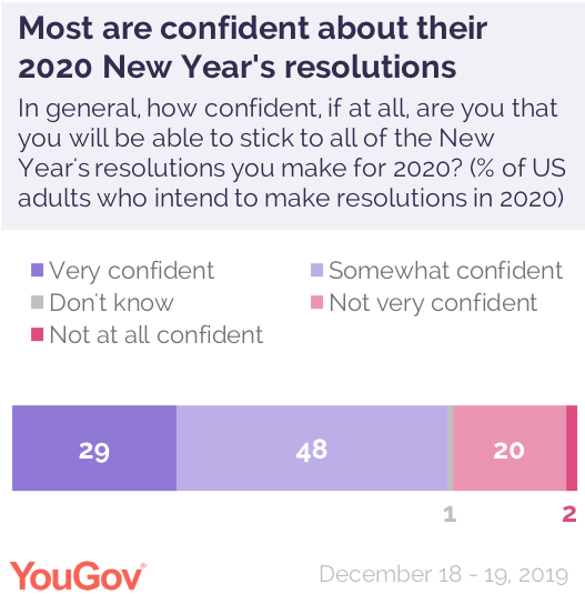 在制定2020年计划的受访者中,29%非常有信心能够坚持下去。近一半的受访者(48%)有些自信;1/5的受访者对坚持自己的计划不是很有信心,2%的受访者完全没有信心。