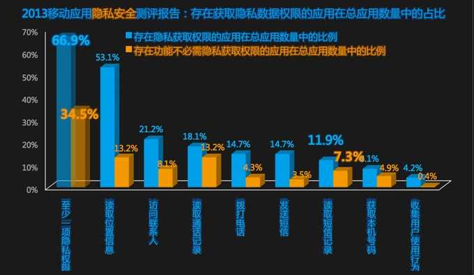 这份报告对国内各类Android 市场下载量前1400 位的Apps 进行了一个评测,结果显示66.9% 的智能手机移动应用在抓取用户隐私数据,其中高达34.5% 的移动应用有“隐私越轨”行为。DCCI 将这里的“隐私越轨”行为定义为: