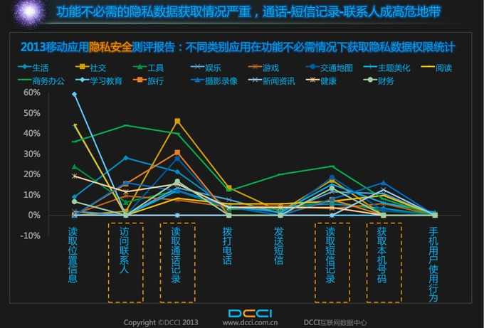 DCCI 刚刚发布了《2013移动隐私安全评测报告》,报告数据显示目前的智能手机安全状况堪忧,主要体现在移动应用的越界抓取用户隐私行为上。