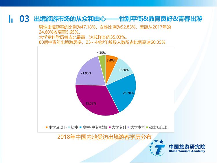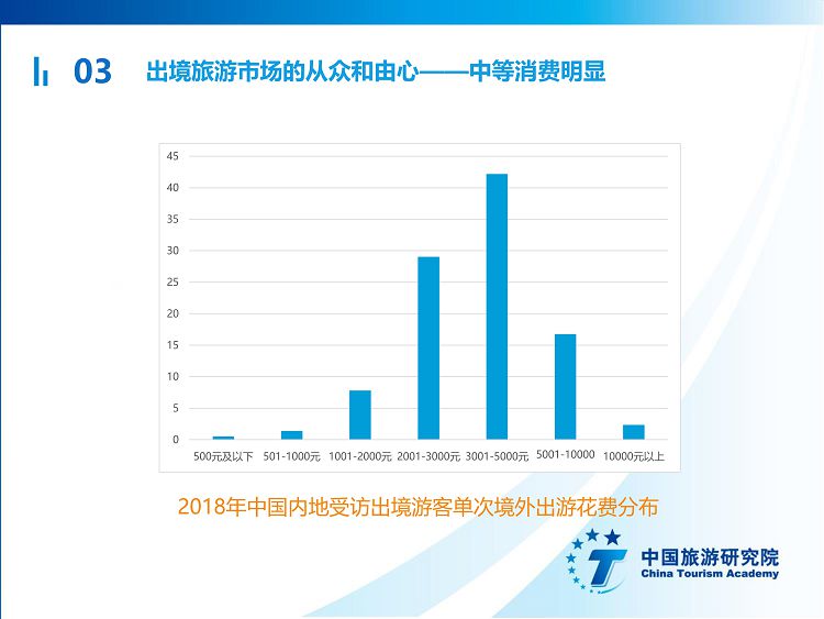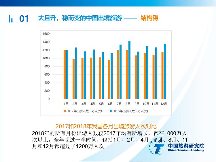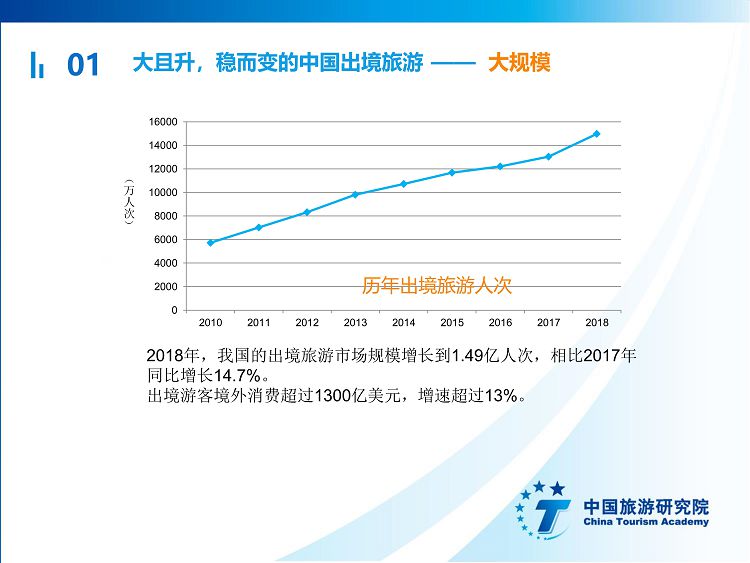 2018年中国出境旅游呈现大且升,稳又变的状态。巨大的旅游市场规模与稳定结构并存,旅游目的地呈现小特征轮动和满意度持续提升的趋势。2018年,我国的出境旅游市场规模增长到1.49亿人次,相比2017年同比增长14.7%。我国出境游客境外消费超过1300亿美元,增速超过13%。不仅中国出境旅游规模不断增大,中国游客对出游目的地的满意度也在不断提升。