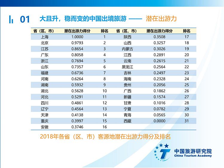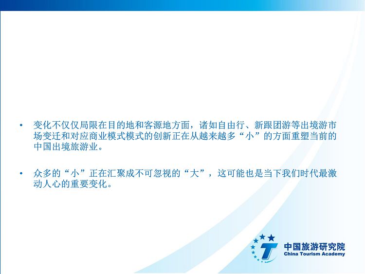 中国出境旅游的稳定性主要体现在目的地流向和分布结构上。在总体稳定的结构下,出境目的地、客源地、出境市场和商业模式创新等方面持续出现“小特征”嬗变。该变化既有市场需求的印痕,也有产业求强创新而带来的主动变化。从总体上看,中国出境目的地表现出“大热带、小热点”。“热带”稳定,“热点”活跃。同时,客源地潜在出游力在东中西三大区域间的比例大约为6.2:2.5:1.3,相比长期处于“7:2:1”的三级阶梯状分布格局,继续呈现收敛趋势。自由行、新跟团游等出境游市场变迁和对应商业模式的创新正在从越来越多“小”的方面重塑当前的中国出境旅游业。报告指出,众多的“小”正在汇聚成不可忽视的“大”,这可能也是当下我们时代最激动人心的重要变化。
