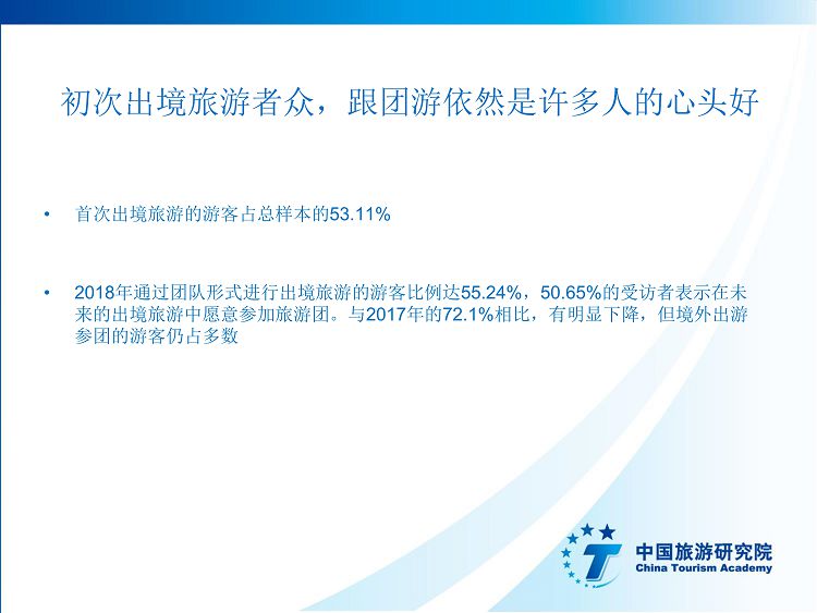 报告指出,中国出境游客既“从众”也“由心”。“从众”表现在,初次出境旅游者众多,跟团游依然是许多人的心头好。“由心”表现在,越来越多的出境游客倾向于自由行,与跟团游几乎势均力敌。