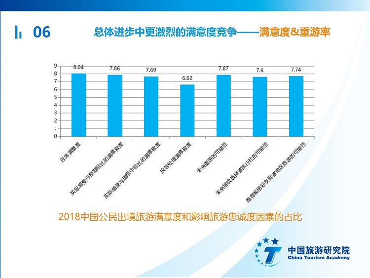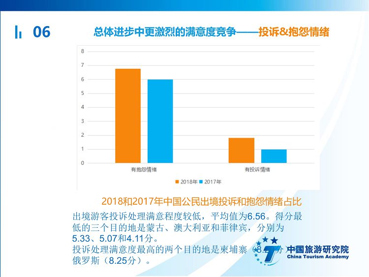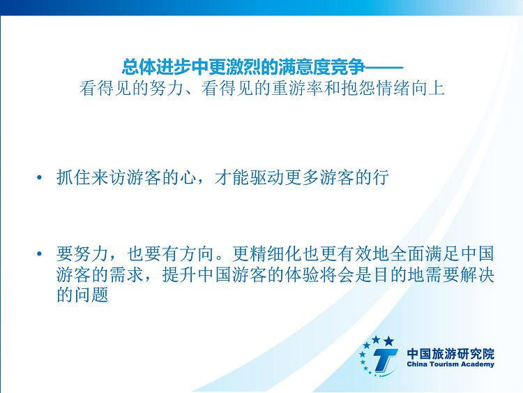 报告强调,中国出境旅游目的地在总体提升的同时呈现出更激烈的满意度竞争。报告指出,中国出境旅游目的地有着看得见的努力和重游率上升,但抱怨情绪也在上升,所以目的地在努力的同时更要有清晰的方向,更精细化、更有效地全面满足中国游客的需求,着力提升中国游客的体验感。