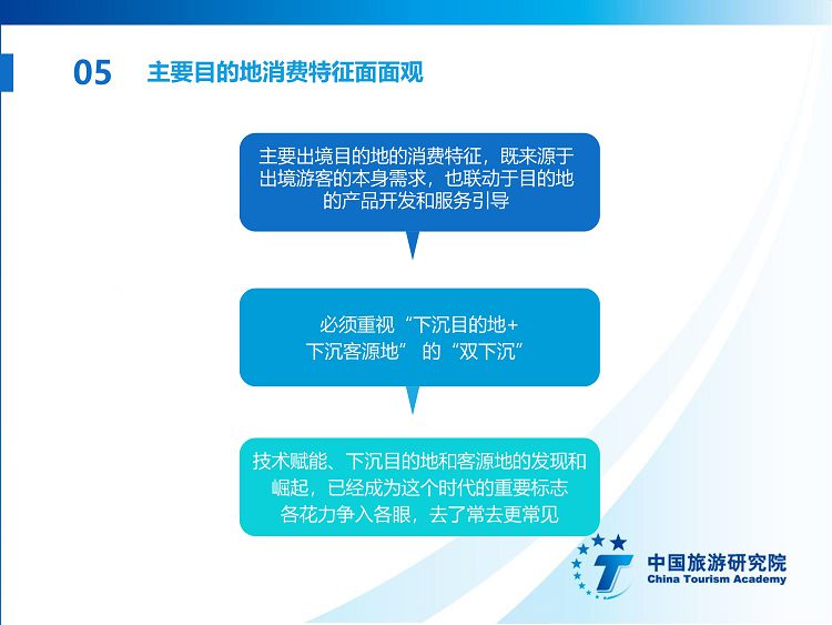 报告指出,中国出境游游客主要出境目的地的消费特征,既源于出境游客的本身需求,也联动于目的地的产品开发和服务引导,必须重视下沉目的地和下沉客源地的“双下沉”趋势。技术赋能、下沉目的地和客源地的发现和崛起,已经成为这个时代的重要标志。