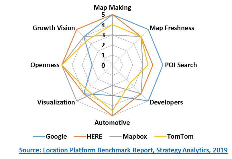 Strategy Analytics评估了全球定位公司谷歌,HERE,Mapbox和TomTom的优势和劣势,评估标准包括地图制作功能,汽车实力,地图可视化,对开发人员的吸引力以及开放性和灵活性。 谷歌和HERE在地图制作能力方面处于领先地位,而谷歌在本地搜索和开发人员覆盖方面处于领先地位。 HERE在汽车和行业增长愿景方面也处于领先地位,并在其他领域也取得了优异的成绩。 TomTom在包括交通在内的多个领域都很强大,而Mapbox在可视化方面表现突出。