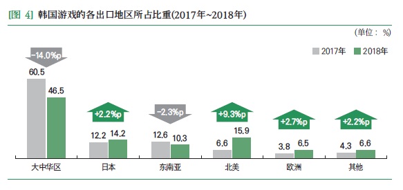 具体目的地层面,截至2018年,尽管由于中国游戏市场本土发展迅猛,和韩国游戏未能获得版号、后继乏力等原因,韩国游戏出口目的地所占比重,中国从60.5%下滑到了46.5%,跌破五成。毕竟不是所有产品都是《穿越火线》《DNF》,所有IP都是传奇。不过尽管如此,中国依然是韩国游戏第一大出口地。