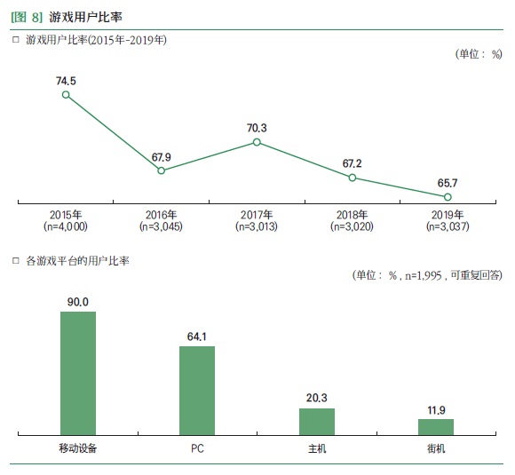 如果排除儿童、老人因素,按照韩国历年人口增长趋势,以韩国人口5180万计算,2019年韩国游戏玩家数量为3400万,与2019年中国的6.4亿游戏相比不成比例。其中,有90%为移动游戏玩家,数量为3060万;64.1%PC玩家,数量2181万;20.3%主机玩家,数量690万;11.9%街机玩家,数量404万。可以发现,和韩国移动游戏和PC游戏玩家是高度重合的。