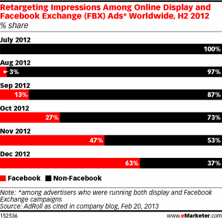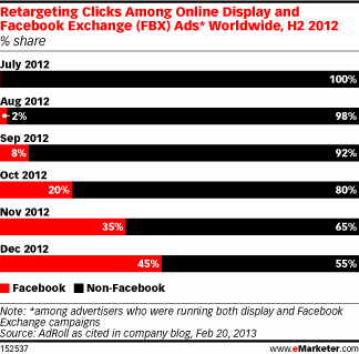 AdRoll发现随着广告主开始使用FBX平台,广告主一大批重定向广告活动开始迁移到该平台上。2012年12月,FBX占AdRoll广告主全部重定向广告展示量的2/3,而FBX刚推出的8月份,Facebook重定向广告展示量仅占3%
