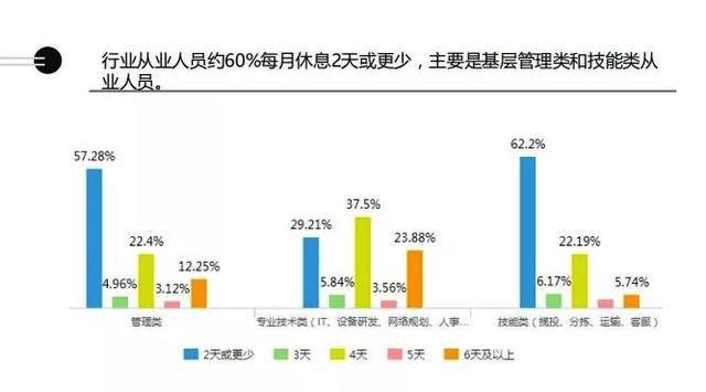 行业从业人员约60%每月休息2天或更少,主要是基层管理类和技能类从业人员。