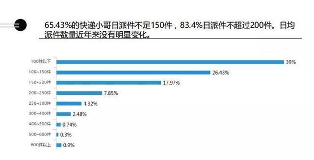 数据显示,65.43%的快递小哥日派件不足150件,83.4%日派件不超过200件,日均派件数量近年来没有明显变化。其中,“通达系”快递小哥日均派件量最多。