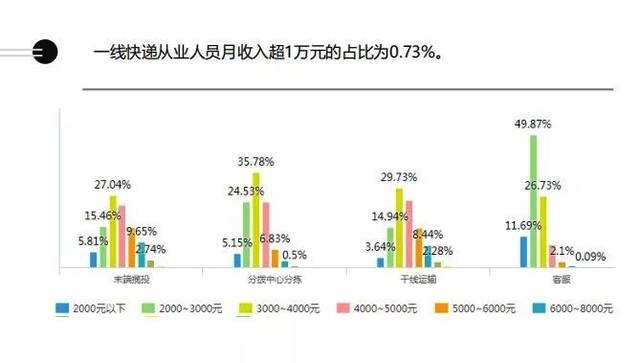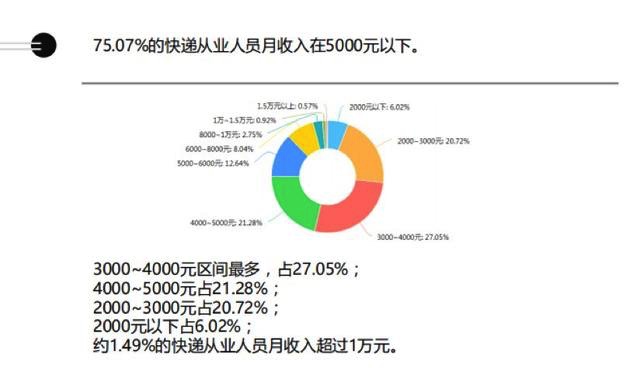 约1.49%的快递从业人员月收入超过1万元,一线快递从业人员月收入超1万元的占比为0.73%。