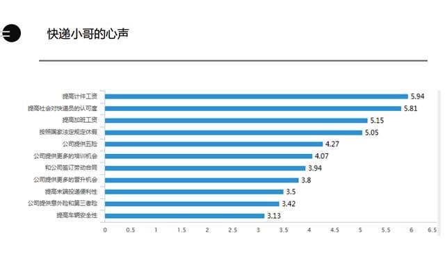 该报告还表达了快递小哥内心的呼声。呼声最高的要求是“提高计件工资”,其次是“提高社会对快递员的认可度”。
