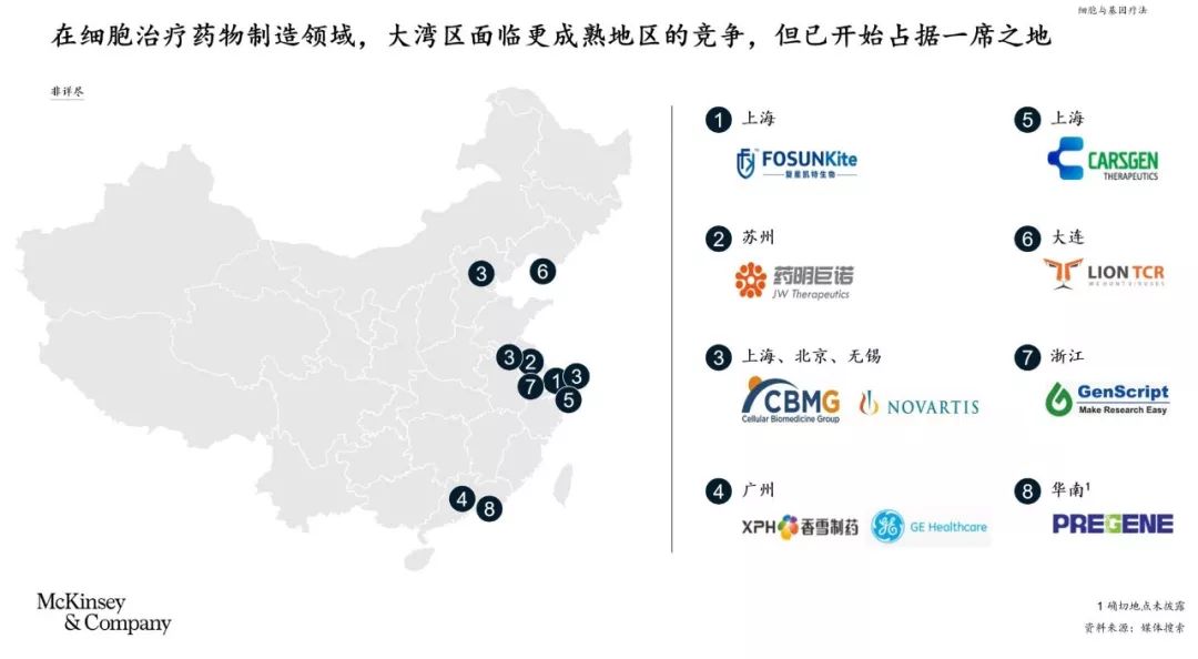 3. 一些跨国公司和新兴的本地生物科技公司已在关注大湾区,预计会有更多动作。制药方面,百济神州选择在广州以商业规模生产PD-1,龙沙集团宣布计划在广州建造其首家大规模制药基地。赛默飞世尔位于广州的精准医疗客户体验中心于2017年正式揭牌;GE医疗生命科学12月宣布,计划与广州开发区合作于2020年开设一家生物制造工艺学院。在细胞治疗药物领域,香雪制药等公司的一些制药厂也如雨后春笋般,纷纷成立。只有在这些先驱者周围,才有望形成一个制造和服务(例如合同研究组织(CRO))生态系统。