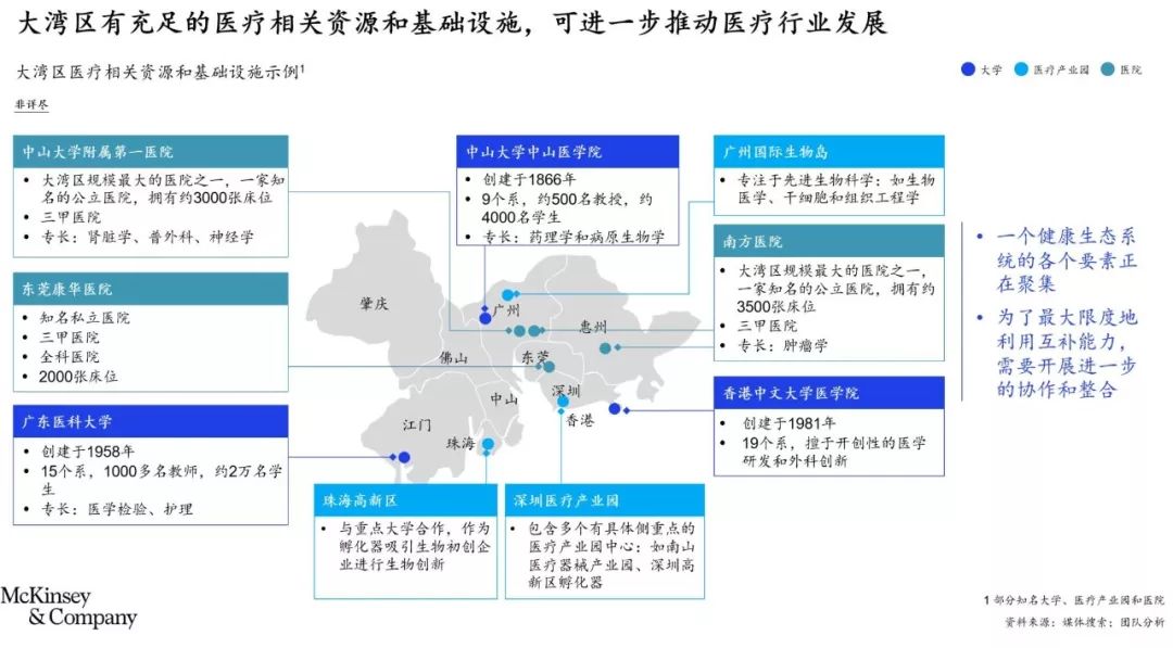 大湾区拥有众多世界一流大学和知名医院及学术中心。香港大学和香港科技大学等4所大学(均位于香港)在2019年QS世界大学排名中跻身全球前100名。大湾区拥有200多所大学,每年有大量大专及以上学历的学生毕业——单单广州每年就有超过57万的大学生毕业。大湾区也拥有众多评价颇高的医学院,其中包括中山大学附属第一医院,这家知名医院拥有3000多张床位。大湾区拥有逾42家可开展临床试验的学术中心,转化医学领域的几位世界知名专家也常驻大湾区,如肺癌领域的权威专家吴一龙教授(广东省人民医院与广东省医学科学院副院长、广东省肺癌研究所所长)。