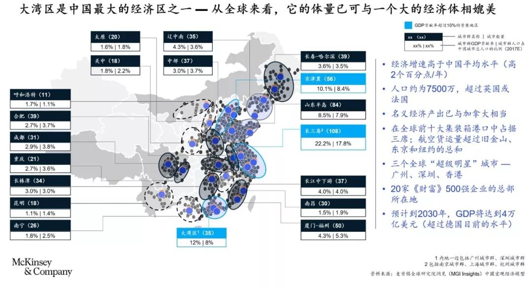 与中国其他地区相比,大湾区的增速更快,人口更年轻。大湾区过去20年的平均增速比中国总体增速快了约两个百分点,目前经济体量占中国经济规模的12.5%。据预测,到2030年,大湾区的经济产出将达3.6~4.0万亿美元,相当于当今德国的经济规模(目前德国为全球第四大经济体)。此外,与中国平均水平相比,大湾区的人口更年轻、更富裕(是中国人均GDP平均水平的2.2倍);每户家庭的消费支出更多;而且人口仍在增长。到2030年,大湾区的人口规模有望突破1亿人。总体来看,大湾区经济机会众多,生活条件良好,并有政府政策扶持,必将继续吸引中国其他地区人口的涌入,而且对具有研究生学历的外籍人才的吸引力也会越来越大。