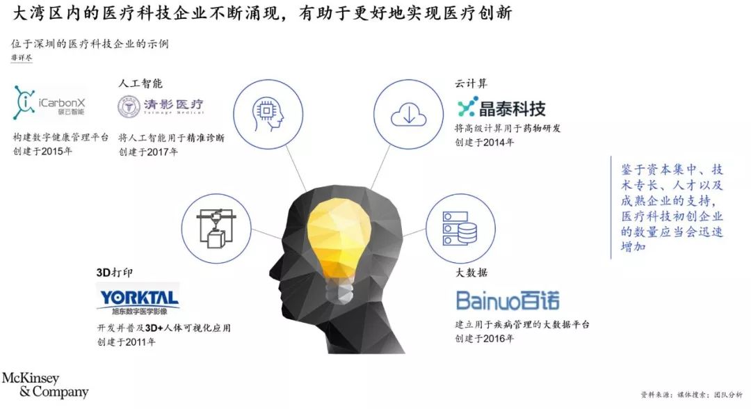 医疗科技。过去几年,大湾区诞生了数家卓越的数据导向型公司,包括华大基因和碳云智能(总部均位于深圳)。华大基因是基因测序服务领域的全球龙头企业之一,而碳云智能则致力于“将人工智能和互联网结合起来,改善人类生活”。除了这两家“探索性”公司以外,初创公司的生态系统已然形成:例如清影医疗将人工智能用于精准诊断,视见科技推动基于人工智能的医学影像,百诺则开发用于疾病管理的大数据平台。此外,腾讯和平安也在参与建设这一生态系统:例如,腾讯投资了碳云智能,而平安管理着一只规模为10亿美元的投资基金——平安全球领航基金(Voyager),该基金主要投资处于成长阶段的金融科技和医疗科技公司。