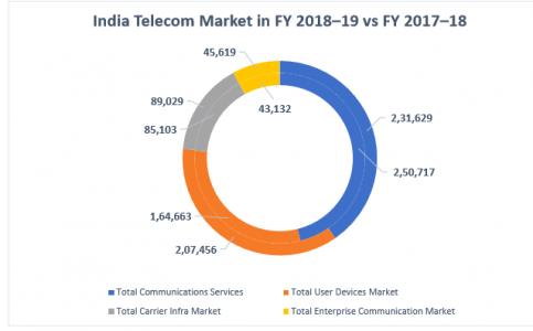 2018-19年,印度电信市场总额增长6%,其中用户设备(手机、平板电脑和数据卡)实现了26%的强劲增长。