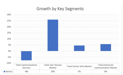 在大规模网络扩建的支持下,运营商基础设施和运营商托管服务部门实现了5%的增长,而企业通信市场也在强劲需求的刺激下实现了6%的增长。