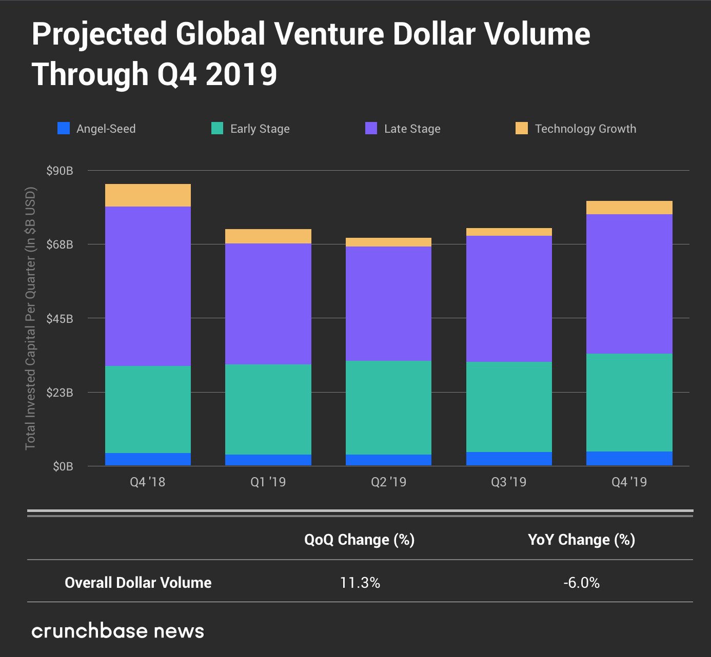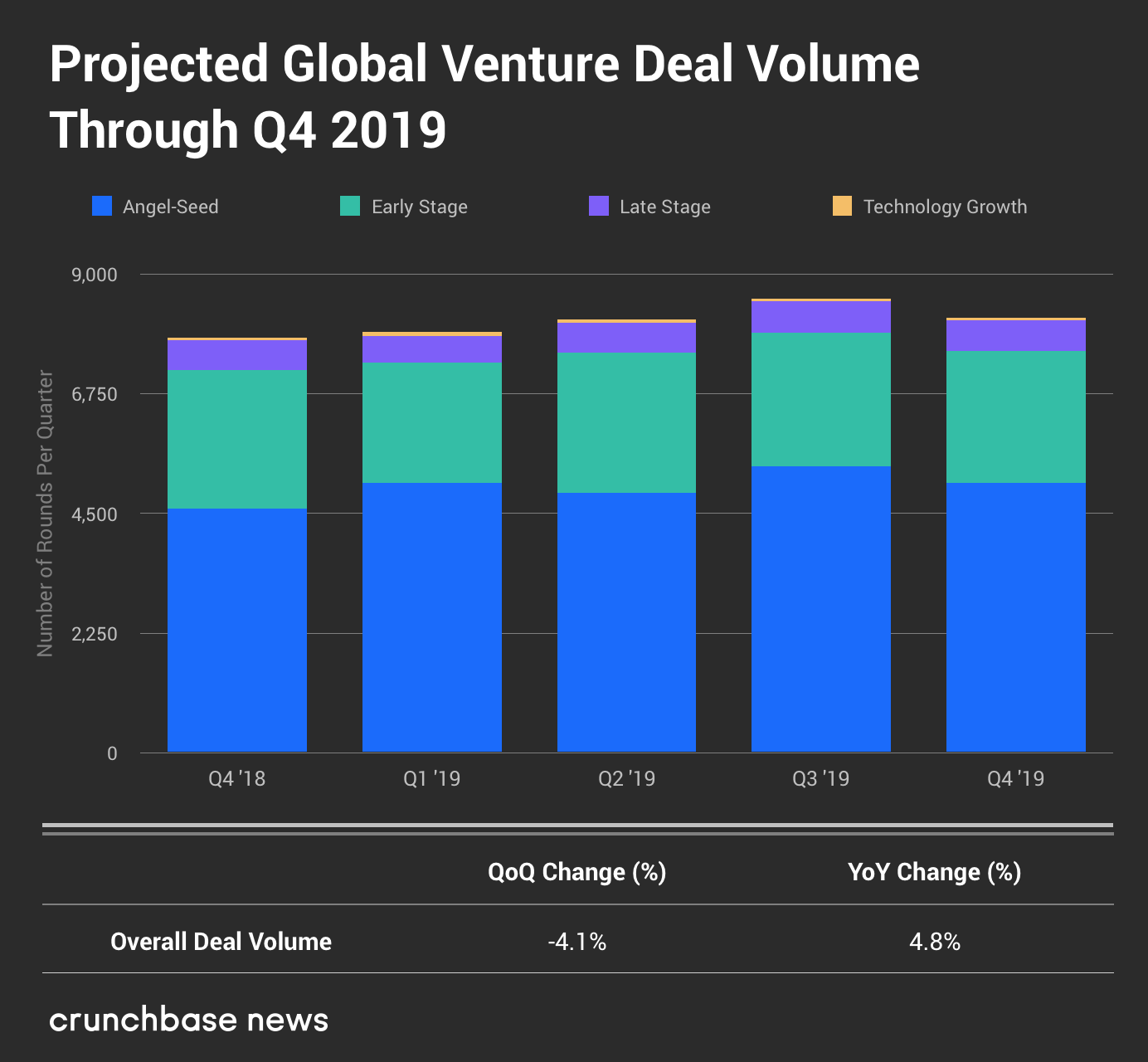 CrunchBase预计,2019年第四季度有8183笔风险投资,略低于第三季度创下的历史新高。自2018年第一季度以来,风险交易量一直徘徊在每季度7500至8500笔,没有经历过明显的上下波动。