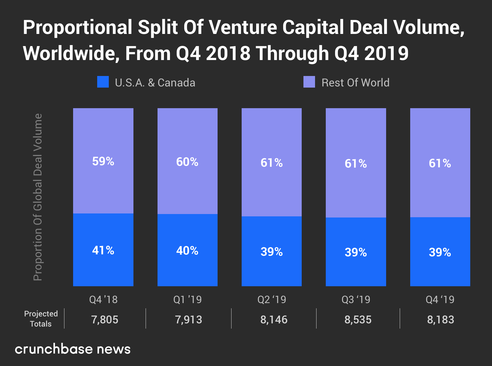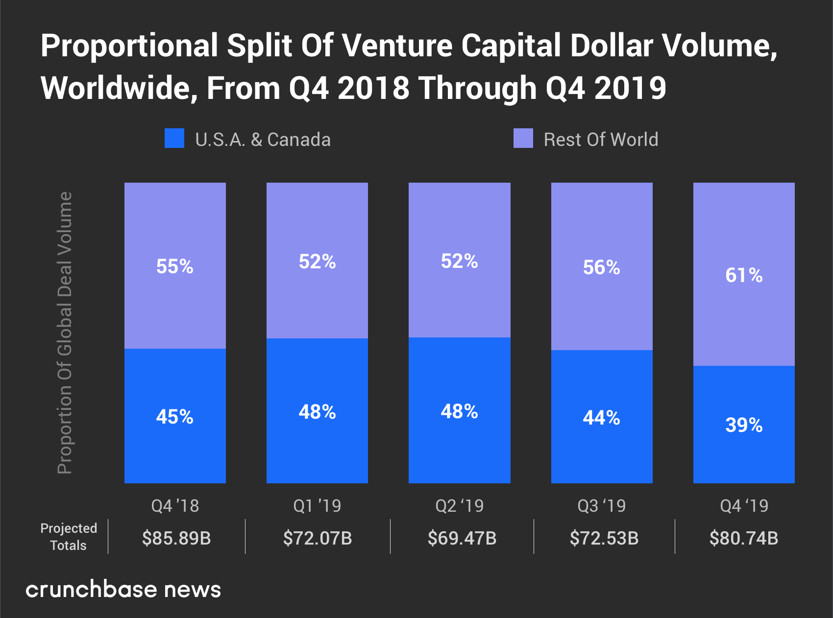 2019年第四季度,北美在全球风险交易量中的份额为39%,是自2018年第二季度以来的最低水平。就像交易量份额一样,现在大部分风险投资都是在北美以外的地区实现的。