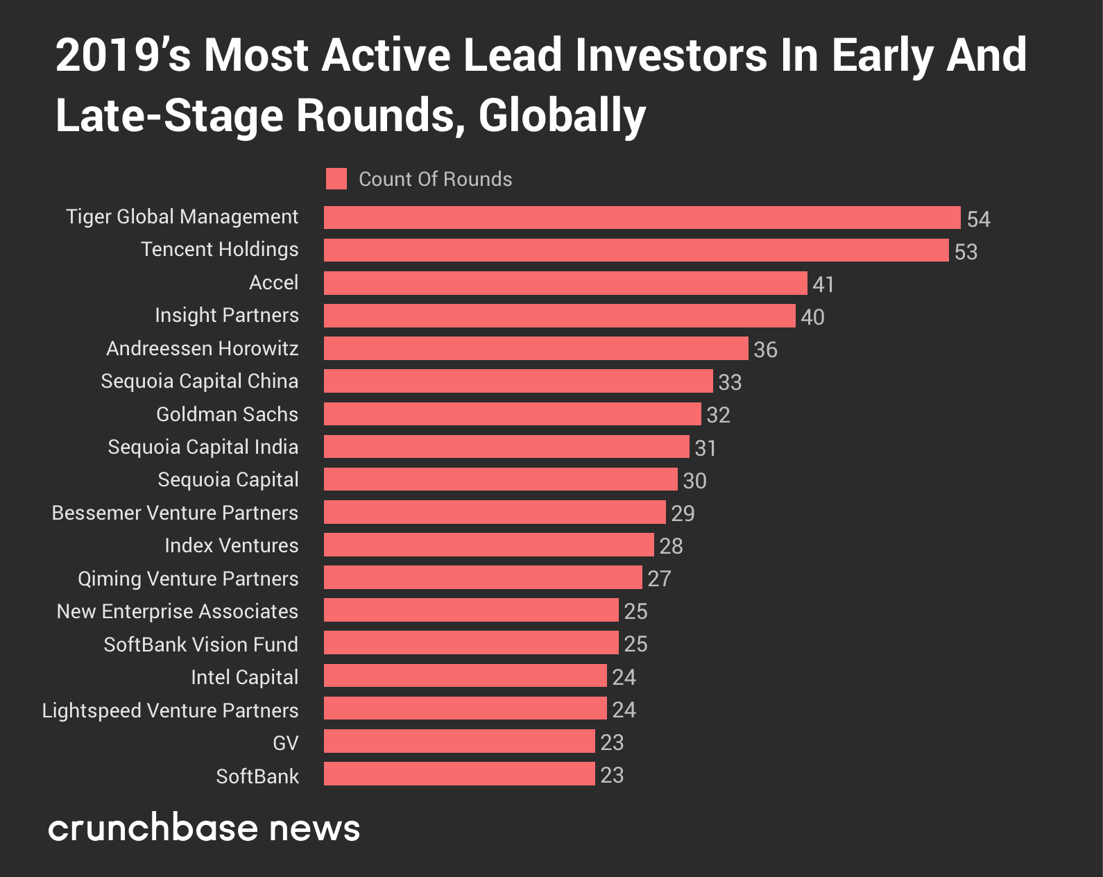 下面的图表展示了风投领域最活跃的领投机构在2019年领投的早期和后期投资。