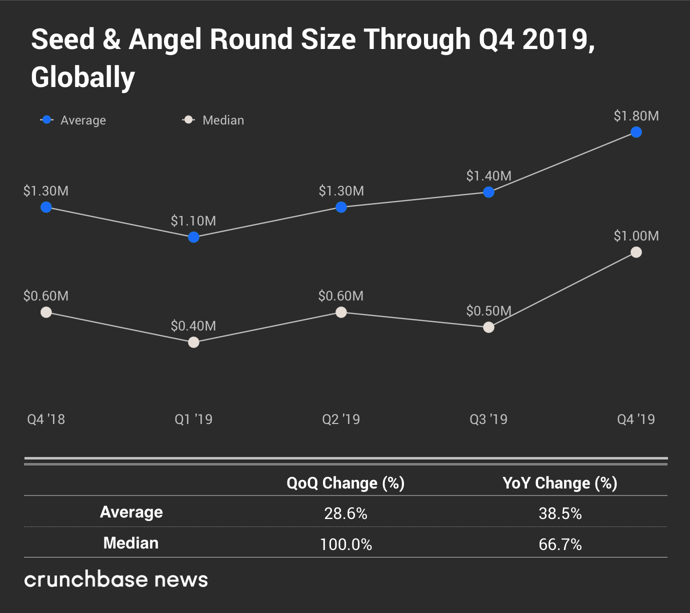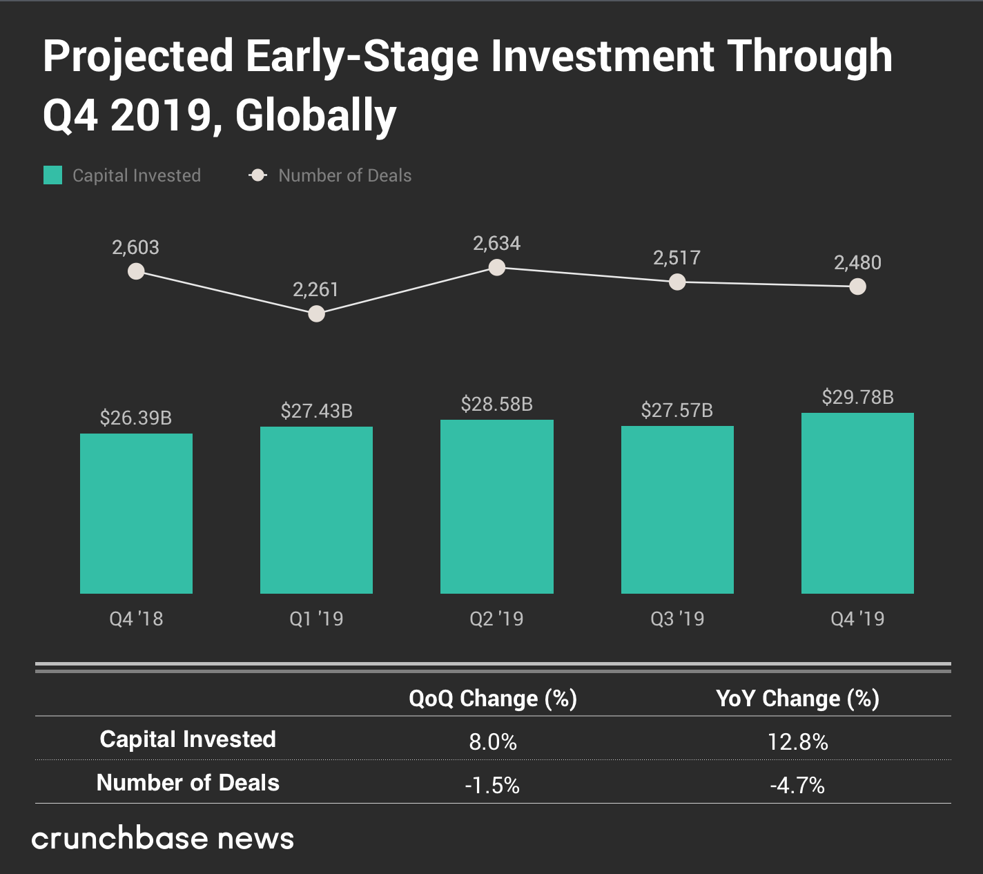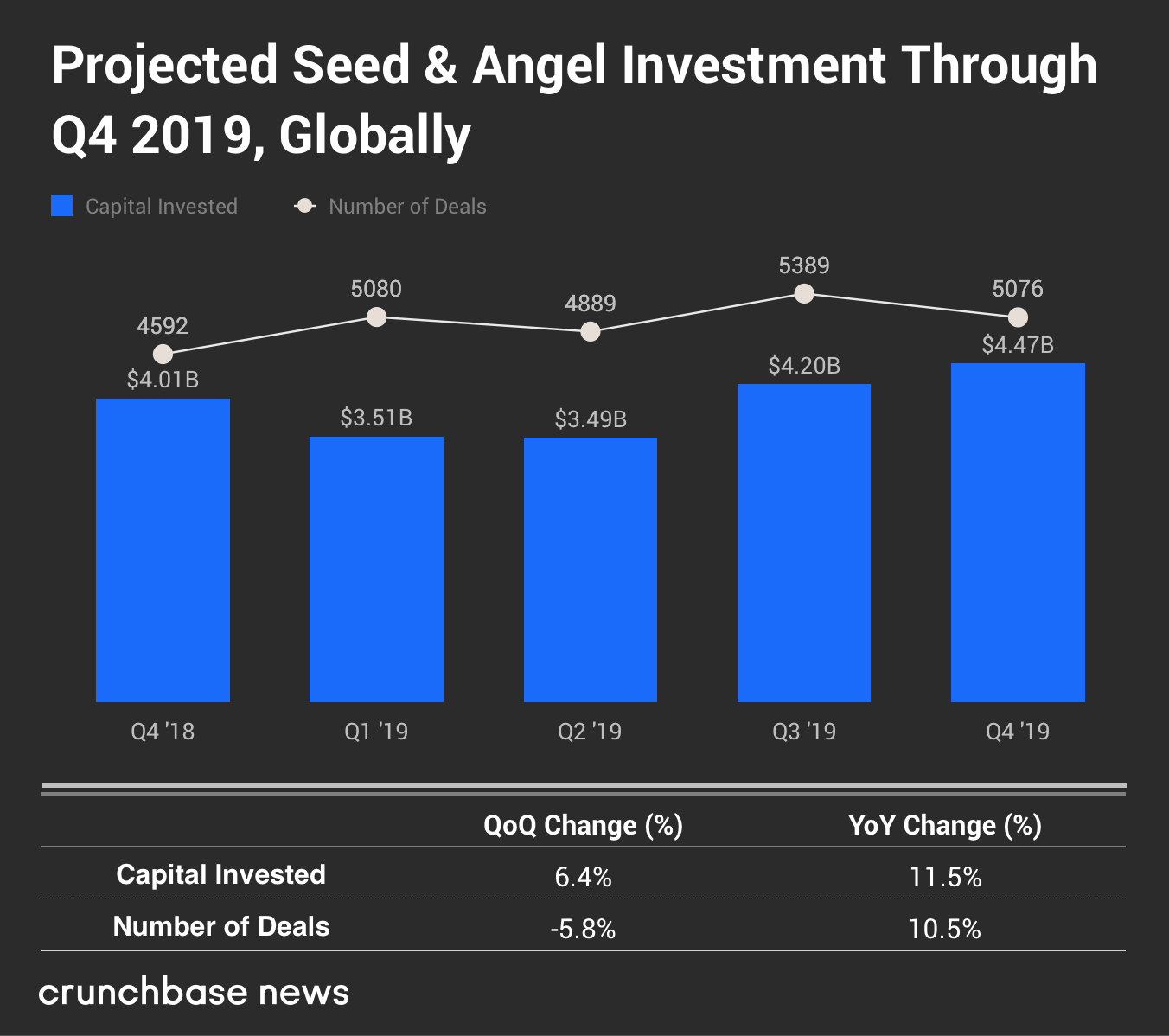 尽管交易量和上个季度的历史最高水平比有所回落,但交易额创下了新的纪录。CrunchBase预计,2019年第四季度的5076笔天使和种子交易共获得了约44.7亿美元投资。