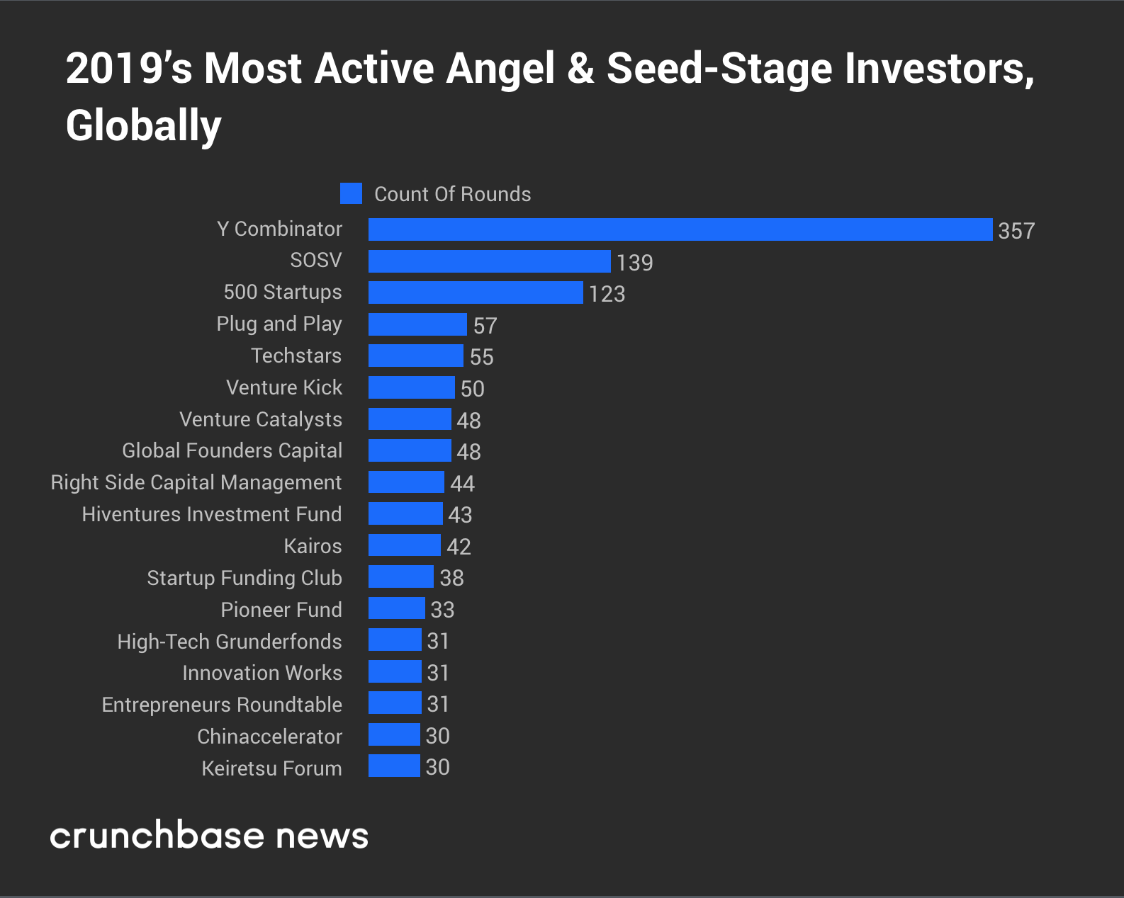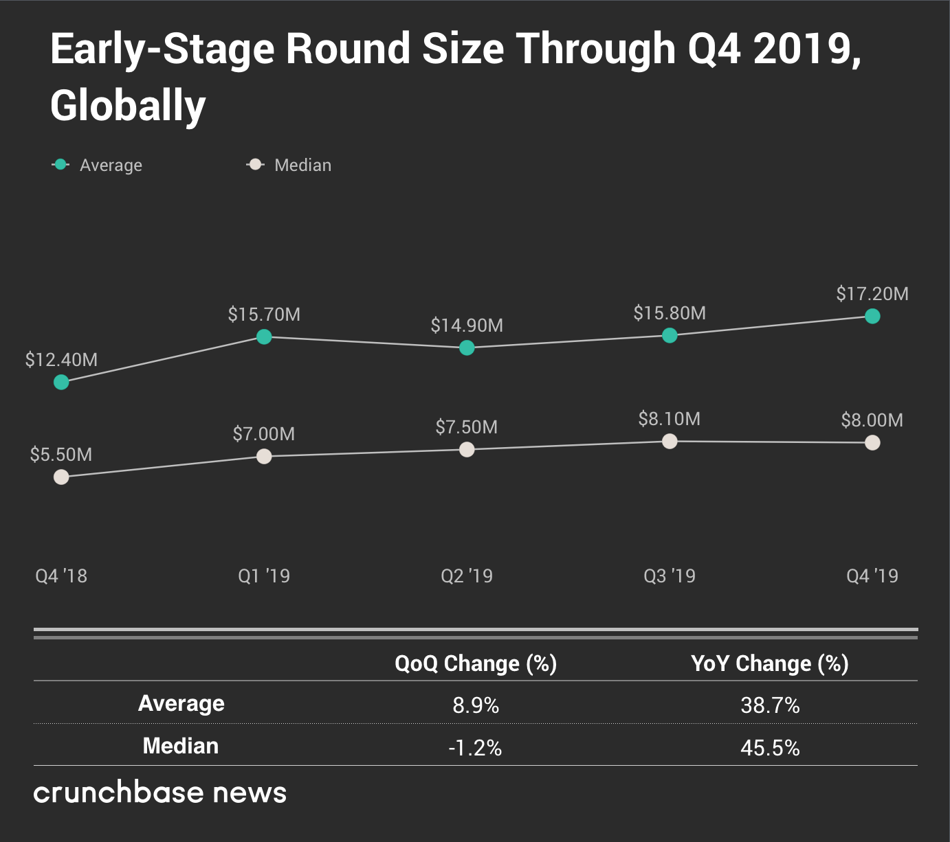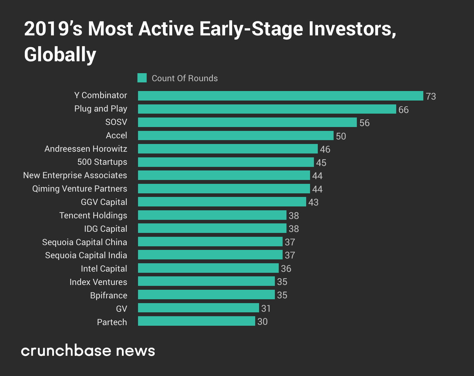 尽管交易量和上个季度的历史最高水平比有所回落,但交易额创下了新的纪录。CrunchBase预计,2019年第四季度的5076笔天使和种子交易共获得了约44.7亿美元投资。