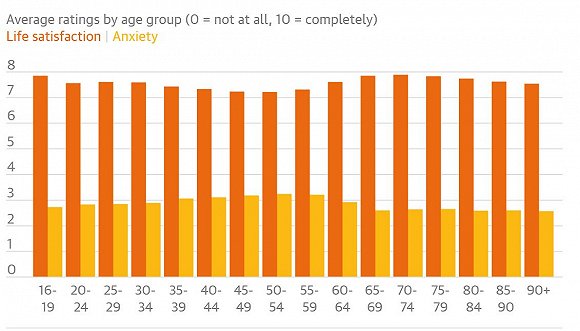 英国国家统计局调查30多万成年人幸福感后也表示,40-59岁的人最不快乐,也最焦虑,90岁以上的人也比这些中年人的生活满意度和幸福感更高。