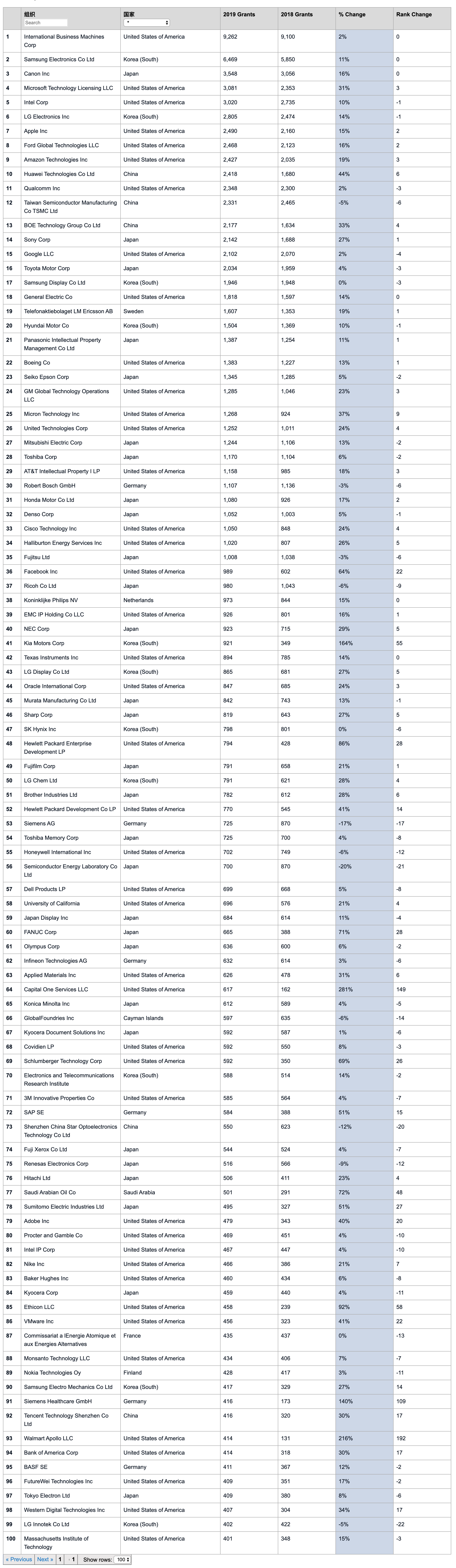 IFI Claims:2019年美国商业专利人Top100 华为升至第10位 美国商业专利数据库(IFI Claims)发布的最新专利报告显示,美国去年共批准33.353万件专利申请。IBM以9262件连续27年蝉联第一,三星电子以6471件连续14年排名第二。华为从去年的第16跃升至第10位,首次跻身前10行列。 排名第3至9位的企业依次为:佳能、微软、英特尔、苹果、LG电子、福特、亚马逊。 韩国企业当中,LG电子以2805件排名第6,现代汽车(1505件)和起亚汽车(921件)分别排在第20和第41。 更多阅读:CCFA:2019年中国超市百强Demand Gen :制造商将数字转换扩展到销售和营销报告数字之旅的时代启幕——空间计算前程无忧:2021年Q1集成电路/半导体市场供需报告乐普医疗新冠病毒抗体胶体金法检测试剂盒、红外测温仪等产品已供往数十国家中电联:2021中国电力行业年度发展科技盛宴再临上海 阿里云栖大会10日开幕省钱省心又安全 企业办公就选戴尔 Vostro 300010张图全面细致解密阿里数据中台建设原理、实践Tiobe: 2020年10月份编程语言调查2017旅游极客开发大赛开始报名,9月初来苏州吧!世界人工智能大会首届RPA+AI论坛,云扩科技五大全新产品引领行业创新多盟与酷云互动达成战略合作,全面布局OTT智能化营销外媒:全球首个MariaDB大会召开 阿里云的数据库应用让人吃惊百度指数:2022九大行业-百度品牌指数榜
