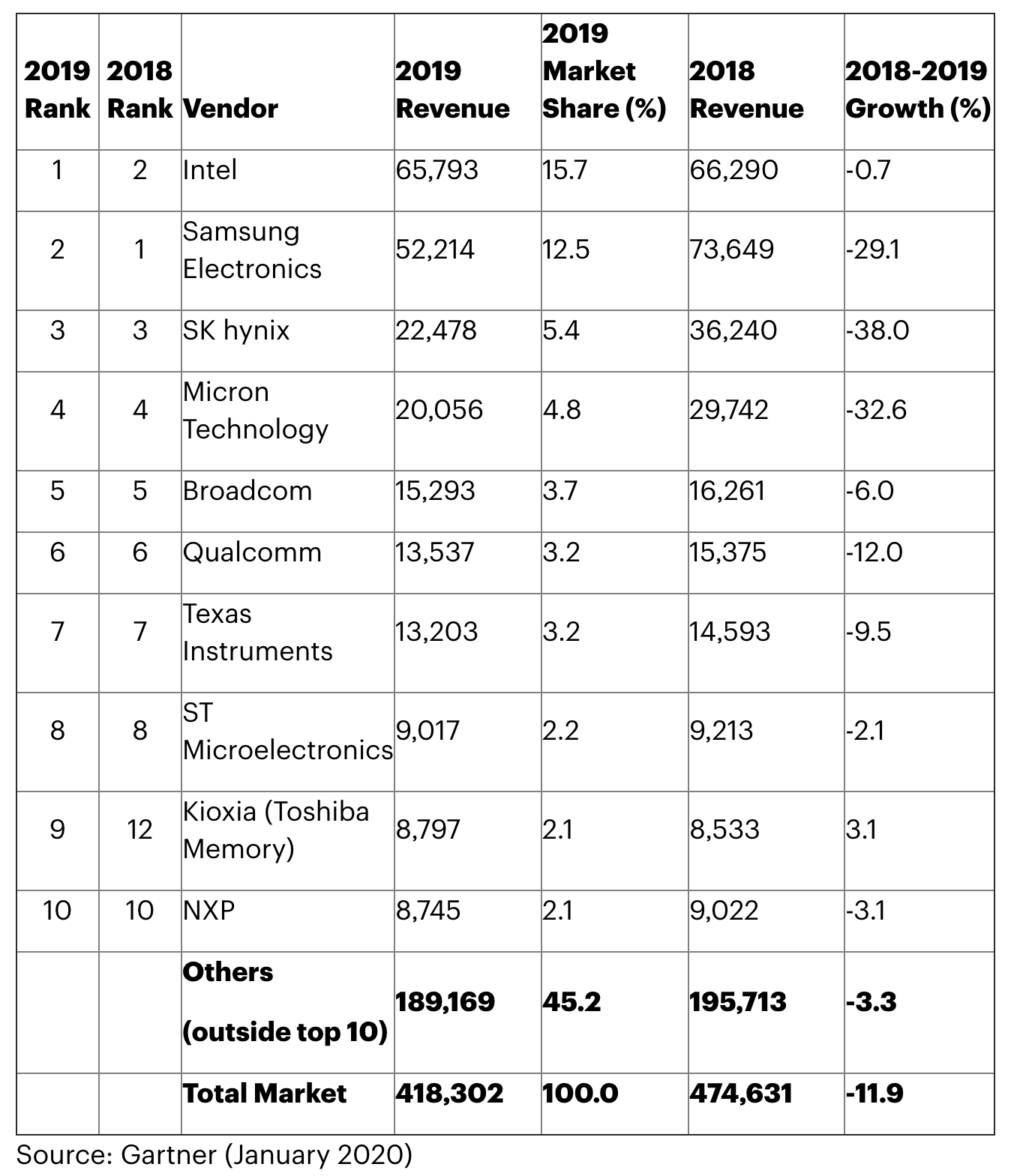 三星2019年半导体销售额为522亿美元,同比减少29.1%。英特尔销售额为657亿美元、同比微减0.7%。
