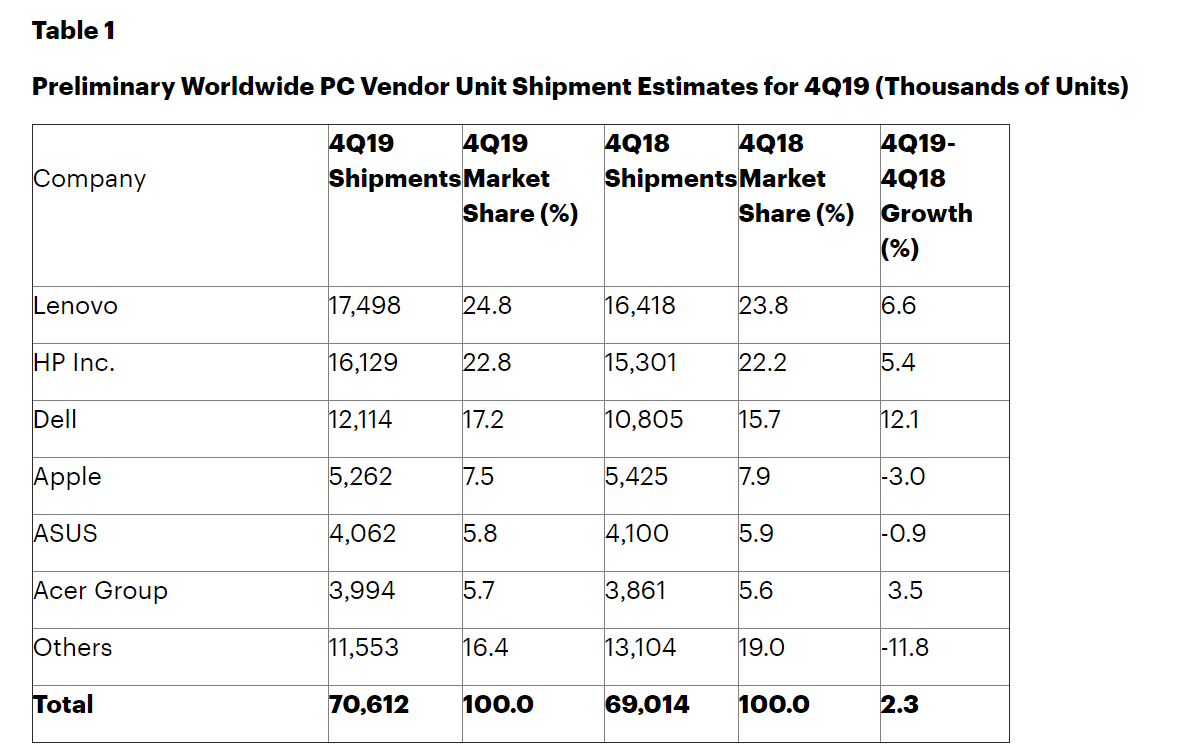 Gartner的最新数据显示,2019年第四季度全球PC出货量增长2.3%,全年增长0.6%。